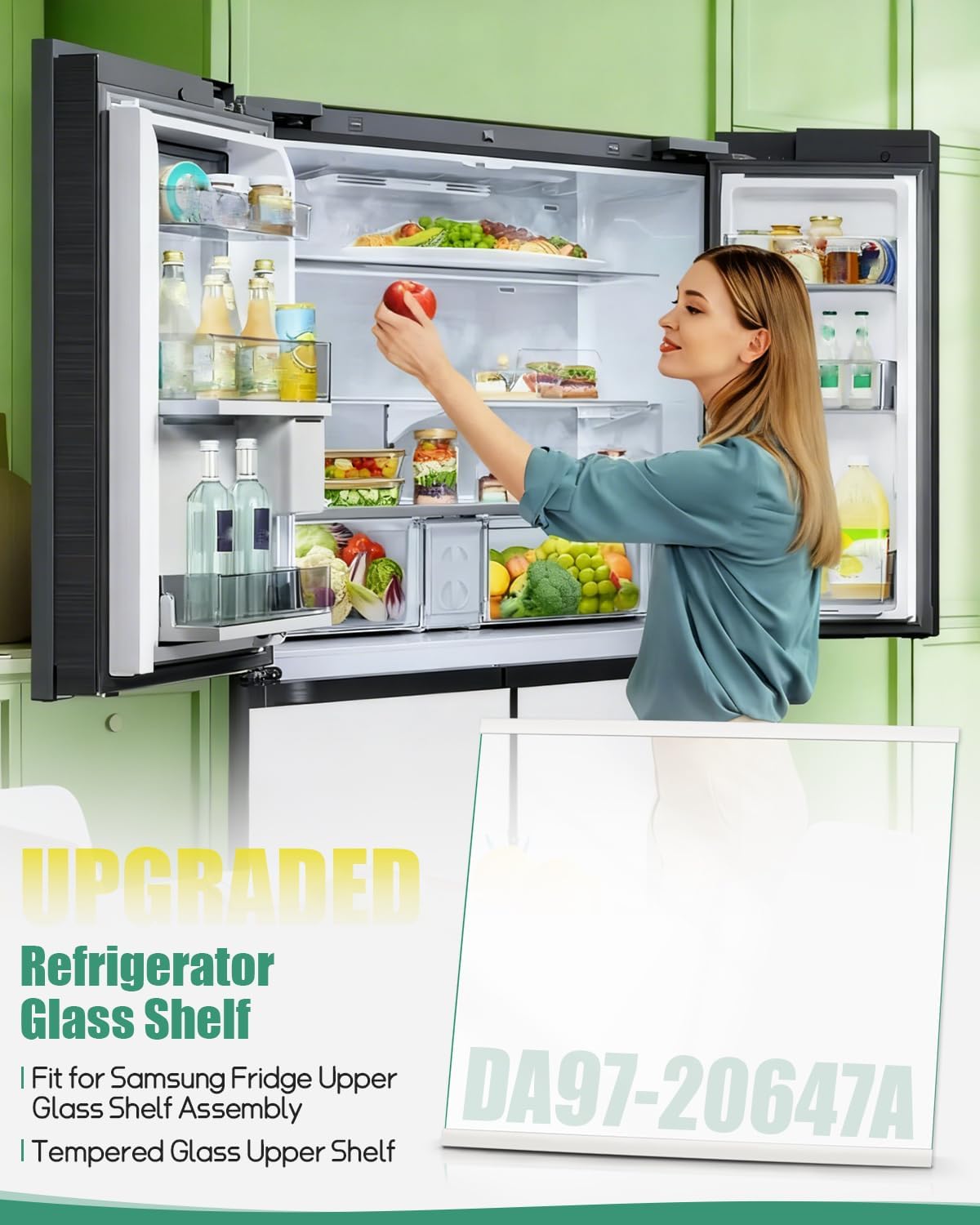 Scope of Application Fit for Samsung Refrigerator: RS22T5201SG/AA, RS22T5201SR/AA, RS22T5561SG/AA, RS22T5561SR/AA, RS23A500ASG/AA, RS23A500ASR/AA, RS22T5201SG/AA-00, RS22T5201SR/AA-00, RS22T5561SG/AA-00, RS22T5561SG/AA-01, RS22T5561SR/AA-00, RS22T5561SR/AA-01, RS23A500ASG/AA-00, RS23A500ASR/AA-00 Replacement Part Number Replace DA97-20637A Advantages 1.Refrigerator glass shelf is made of tempered glass, which is hard, resistant to drop, impact, wear and long service life 2.Freezer tempered glass shelf is resistant to high and low temperatures, can withstand rapid temperature changes and prevent cracking 3.Lower tempered glass shelf adopts transparent design and has a smooth surface, which can easily wipe off dirt to keep the glass clean and beautiful