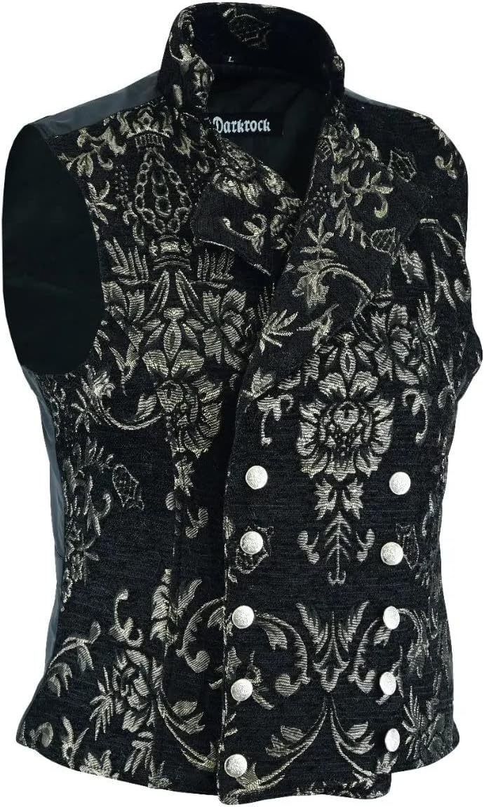 Make a bold statement with this exquisite Gothic brocade vest from Darkrock. The striking black fabric features an intricate silver-gold floral damask pattern that adds sophistication and vintage charm to any ensemble. This double-breasted vest is adorned with polished silver buttons that create an elegant contrast against the ornate brocade design. The high collar and fitted silhouette offer a classic Victorian-inspired look, while the back tie adjustment ensures a perfect fit. The sleeveless design and quality construction allow for comfortable movement while maintaining a sharp appearance. Perfect for formal occasions, gothic fashion enthusiasts, or adding a dramatic flair to your wardrobe, this vest can be paired with dress shirts, suits, or worn as a standalone statement piece. The timeless design combines historical elegance with modern styling, making it versatile enough for various occasions from formal events to alternative fashion statements. The detailed craftsmanship of the brocade pattern and strategic button placement creates a flattering silhouette that stands out in any setting.DR#1121-Black & Gold