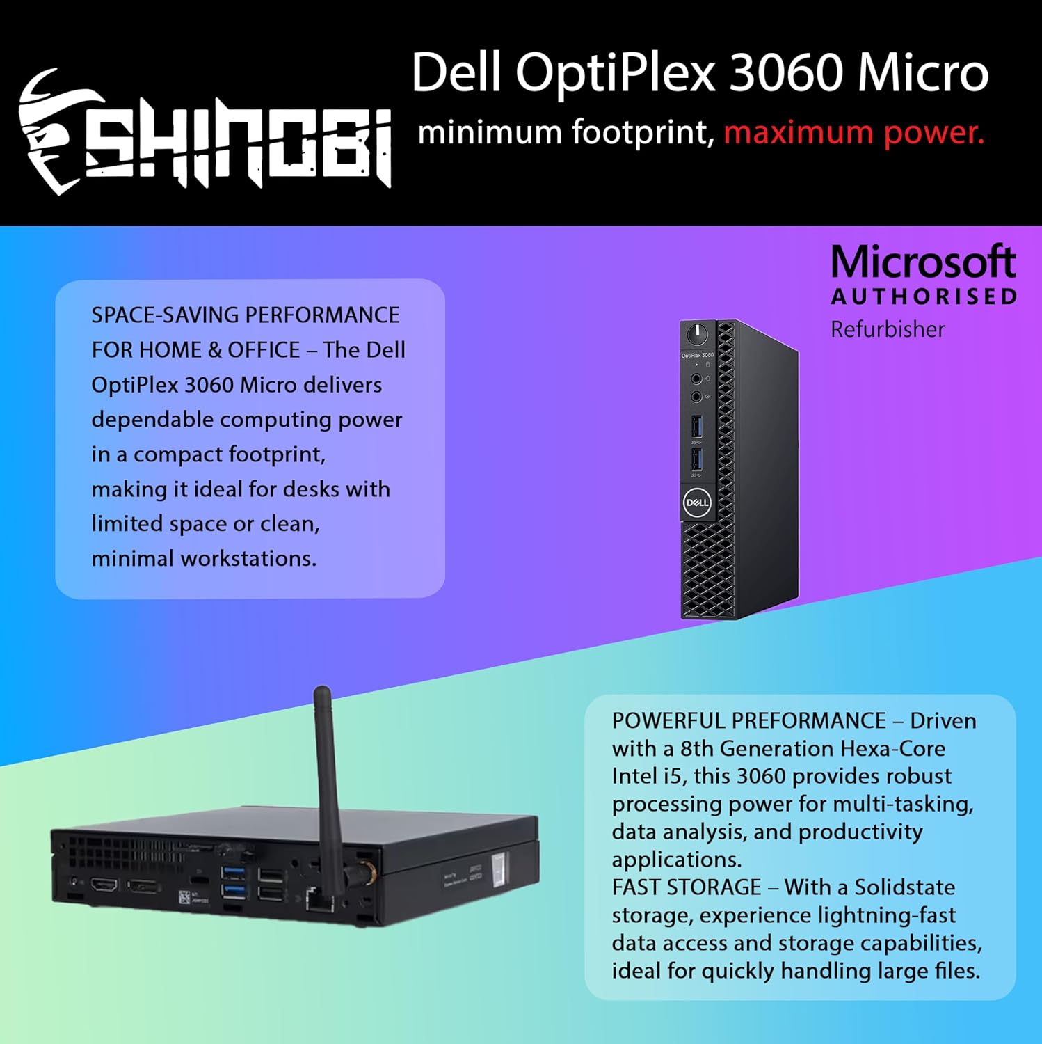The Dell OptiPlex 3060 Micro is a refurbished business-class desktop that balances performance, compact design, and cost efficiency. Powered by an Intel Core i5 8th Gen Hexa-Core processor, this ultra-small PC is ideal for home offices, front desks, conference rooms, and tight workspaces.Each unit is configured for dependable performance with 32GB DDR4 RAM and a 1TB NVME, enabling fast boot-up, quick response times, and plenty of storage for apps, documents, and media.Reliable Connectivity & Professional Setup -AX210 WiFi 6E & Bluetooth 5.3 Built in! – Wireless freedom for network access and device connectivity - Windows 11 Pro – Secure, modern, and business-ready operating system Compact, Flexible, and Efficient - Ultra-small footprint – Easily fits on or under desks, or behind monitors with included mount - Energy-efficient and quiet – Ideal for focused work environments As a Microsoft Authorized Refurbisher, Refurb Ninja professionally renews each system through rigorous testing and certification. The OptiPlex 3060 Micro is a smart, sustainable solution for users seeking reliable performance in a compact package.