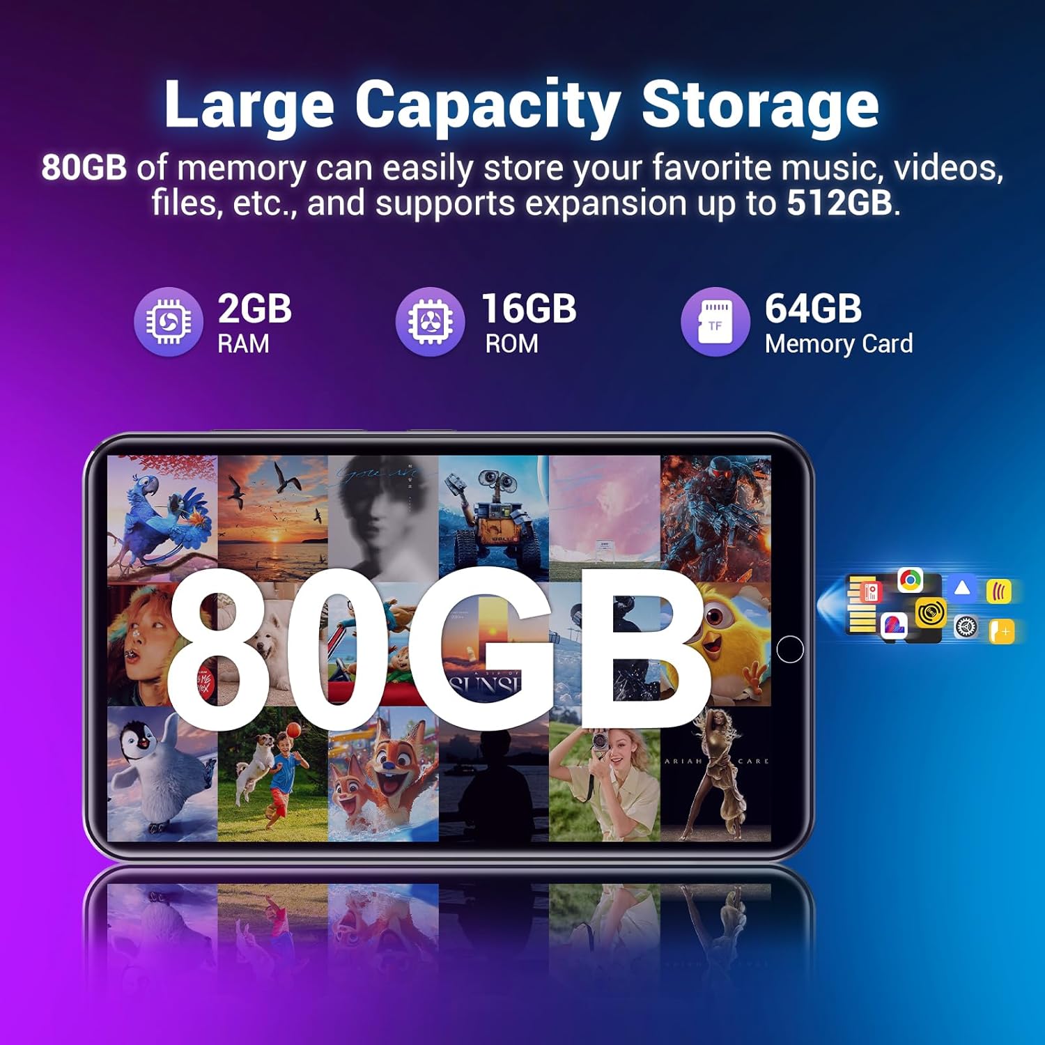 | BuiltIn Media | What's Included in the Box: Diofox Android MP3 Player (Black) 64GB MicroSD Card (pre-installed) USB-C Charging Cable Wired Earphones Screen Protector Protective Silicone Case User Manual |