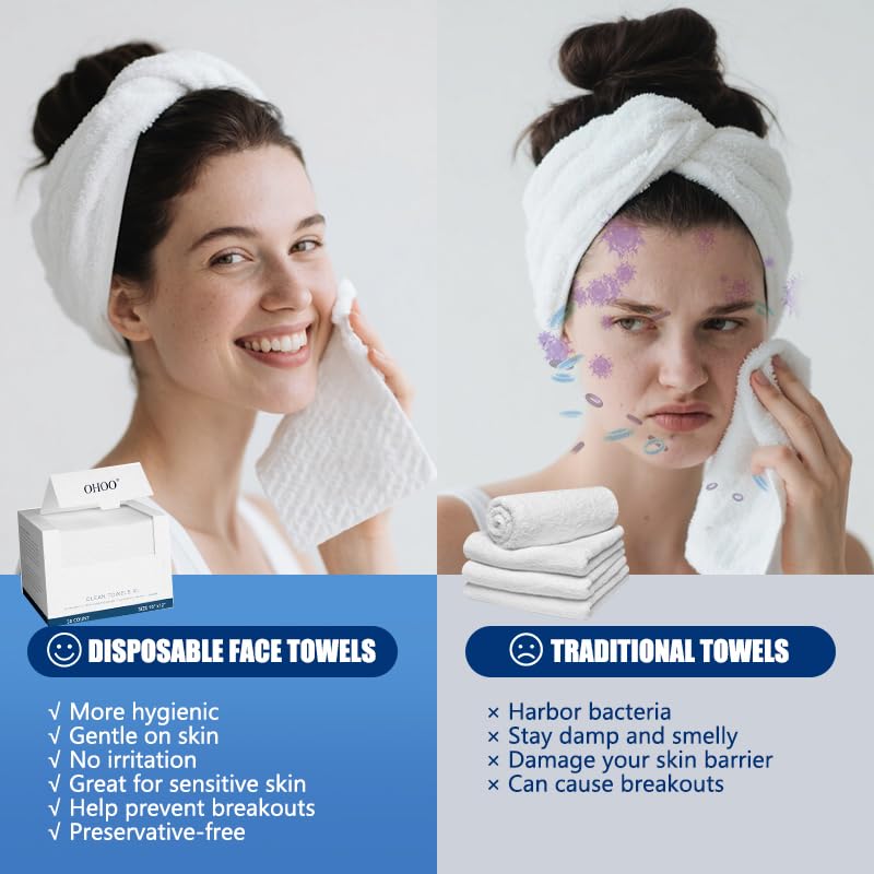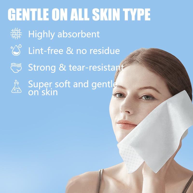 Disposable face towels are great for daily skincare. They measure 10"x12" and are thick and soft. They clean gently soaking up moisture. They leave your skin fresh and dry. You can use them for many things like cleaning your face or hands, taking off makeup, and caring for babies. They are very handy and easy to use.