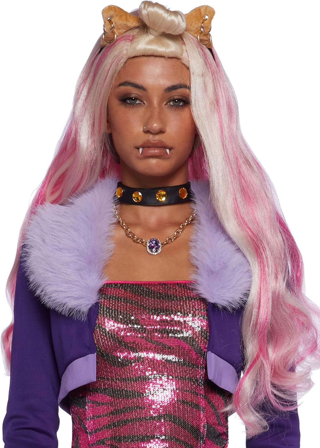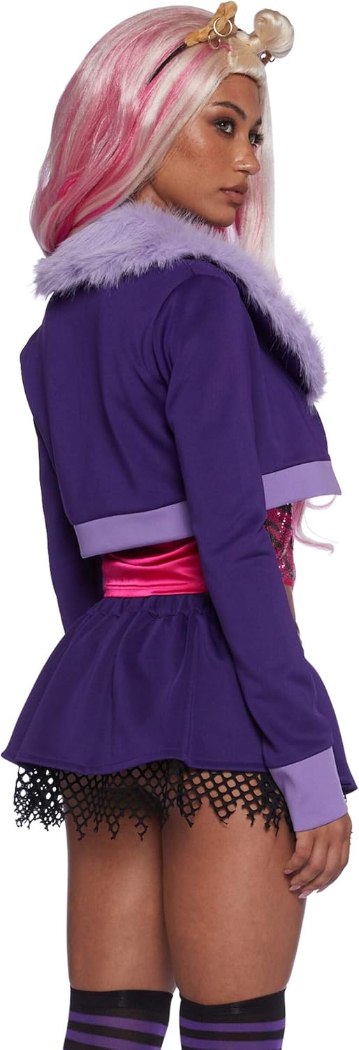 Unleash your wild side with the Dolls Kill Werewolf High School Student Premium Costume and Wig Set by Trickz N’ Treatz. This detailed set includes a stretchy knit jacket with faux fur trim, a pleated skirt with gemstone details, a tiger-print sequin tube top, and a mesh underskirt. Accessories like a gemstone choker, faux fur ear headband with piercings, faux fangs, striped socks, and a blonde wig with pink highlights complete the look. Designed with playful details and comfortable fabrics, this werewolf-inspired costume is perfect for Halloween, cosplay, or themed parties.