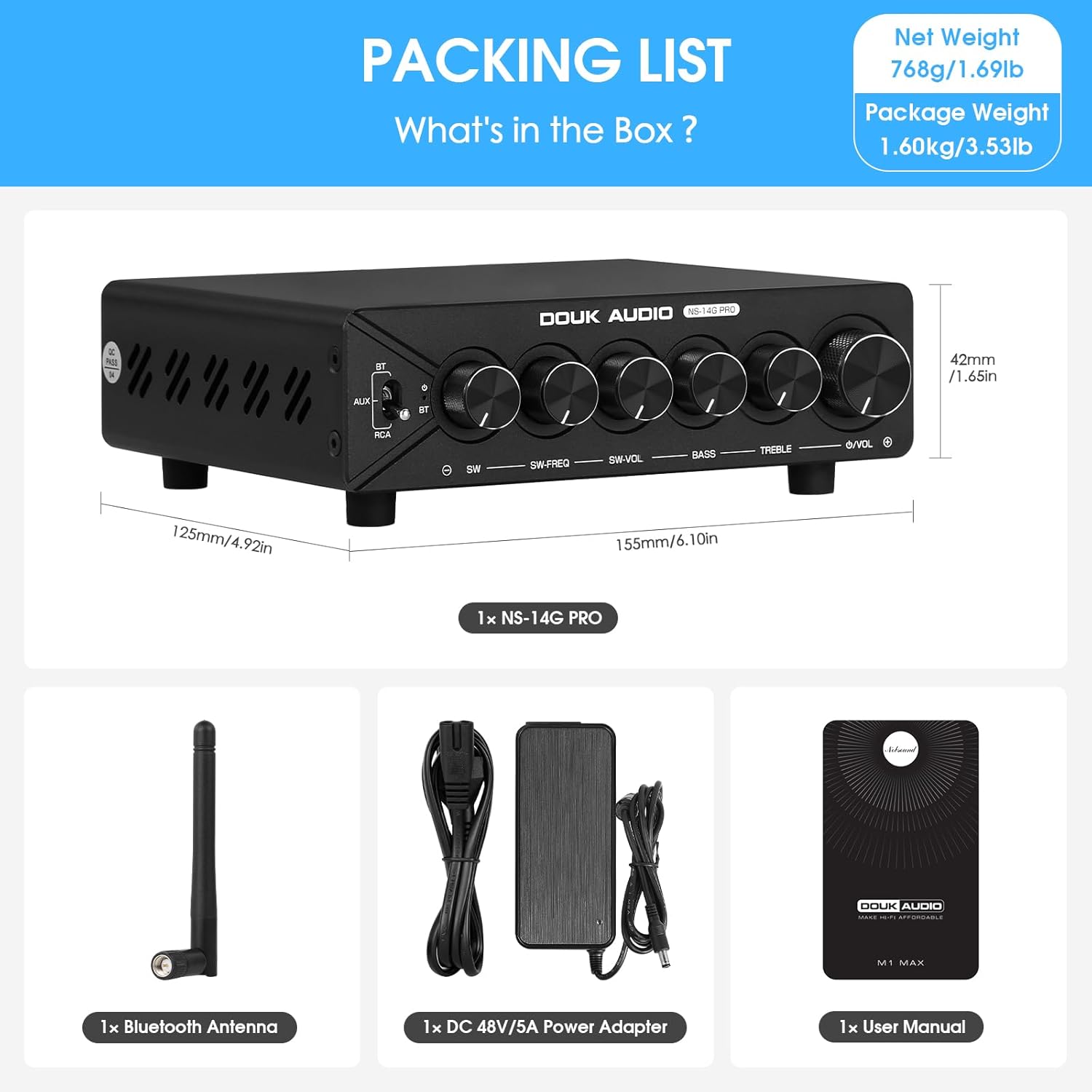 Parameters Brand: Douk Audio Model: NS-14G Pro Audio input: Stereo RCA/AUX/Bluetooth Audio output: Banana speaker jacks/AUX Chipset: TPA3255*2+QCC304X (supports aptX/aptX LL/aptX HD/SBC/AAC) Max. output power: 300W*2 (L/R channel)+300W (subwoofer) Number of channel: 2.1 Speaker impedance: 4-8Ω(L/R) 2-8Ω(subwoofer) THD+N: 0.01% (1kHz) SNR: ≥108dB Frequency response: 20Hz-20kHz Subwoofer gain: ±4dB Subwoofer cutoff frequency range: 50Hz-220Hz Bass/treble adjustment range: ±6dB AUX output level: 1.4V Input sensitivity: 2V Bluetooth max. sampling rate: 48KHz/24bit Working voltage: DC 24-48V Dimensions (W*D*H): 155*125*42mm / 6.10*4.92*1.65in Package dimensions (W*D*H): 300*230*70mm / 11.81*9.06*2.76in Net weight: 768g / 1.69lb Package weight: 1.6kg / 3.53lb Packing list 1* NS-14G Pro Power Amplifier 1* DC 48V/5A Power Adapter 1* Bluetooth Antenna