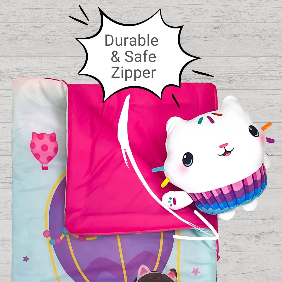 Allow your child's imagination run wild with this Gabby's Dollhouse Slumber Sling Bag Set! Young fans of the popular DreamWorks series will love getting cozy with Gabby and her cat-tastic kitty friends with this colorful Slumber Sling Bag set. Created for kids, designed with parents in mind, this lightweight slumber bag was designed so that kids can easily roll and tuck into the sling bag, and allows for easy transport. Parents will also love how compact this slumber bag is. When laid out flat, slumber bag measures 46"(L) X 26"(W) and when inside its sling bag, product measures 16"(L) X 17"(W). Kids can also use this slumber bag for sleepovers, movie nights, story time, or whenever they want to get cozy. Gabby and Pandy Paws are all here to bring the imagination and fun that make the DreamWorks series a hit. Kids will drift to sleep in plush comfort as they imagine many fun and magical adventures at Gabby’s Dollhouse.