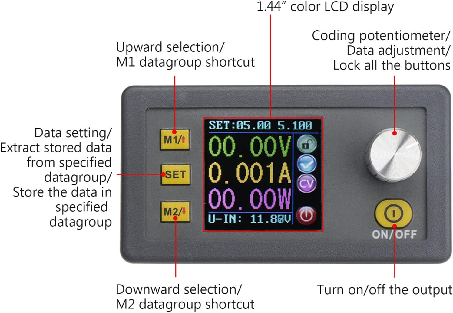 PARAMETERS: Input voltage range: DC 6-55V Output voltage range: DC 0-50V Output current range: 0-5A Output power range: 0-250W Output voltage resolution: 0.01V Output current resolution: 0.001A Output voltage measurement accuracy: (0.5% + 1 digit) Output current measurement accuracy: (0.5% + 2 digits) Product dimension: 79mm x 43mm x 48mm Open size: 71mm x 39mm Note: You must make sure that power supply input voltage must be 1.1 times more than the output. WIRING INSTRUCTION: IN+: input positive OUT+: output positive IN-: input negative OUT-: output negative WARM TIPS: 1. The input voltage range is DC 6-55V and 55V is the maximum voltage, so please leave room for usage, or the module will be burnt. 2. The input must be DC-DC, unable to use AC 220V to directly supply electricity, or else the module will also be burnt. 3. Although electric converter has input reverse polarity protection and output short-circuit protection, you must be in strict accordance with connection description to connect. If you connect power supply to the output terminal,This module may be burnt.