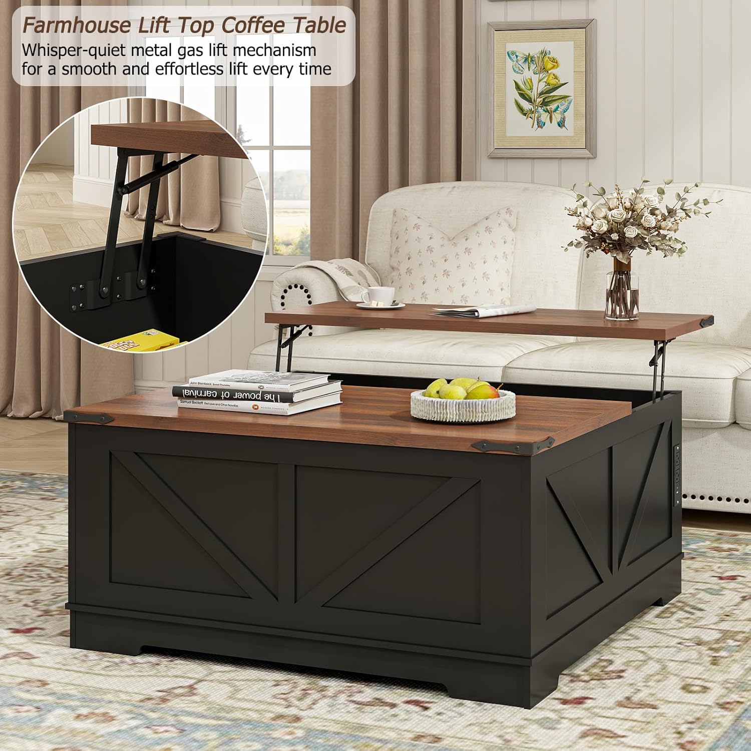 This generously sized coffee table (39.4"x39.4") serves as the perfect center table for large living rooms. It features charming barn door-style side panels, metal corner accents, and four elegant two-tone finish (choose from 4 colors) bring warm, character-filled style to your space without looking bulky or overwhelming.