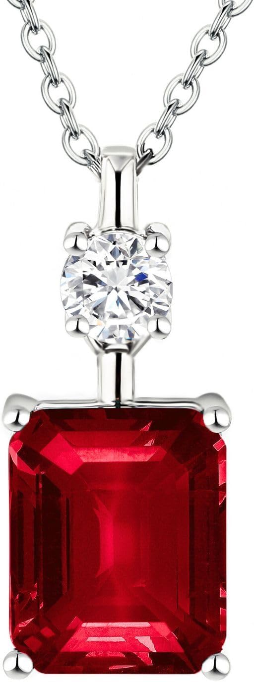 EcoGems Lab Grown Gemstone & Diamond Pendant Necklace – Emerald Cut, 18K White Gold Plated Silver – 16/18 Inch Adjustable Chain – Color Options – Gift Box