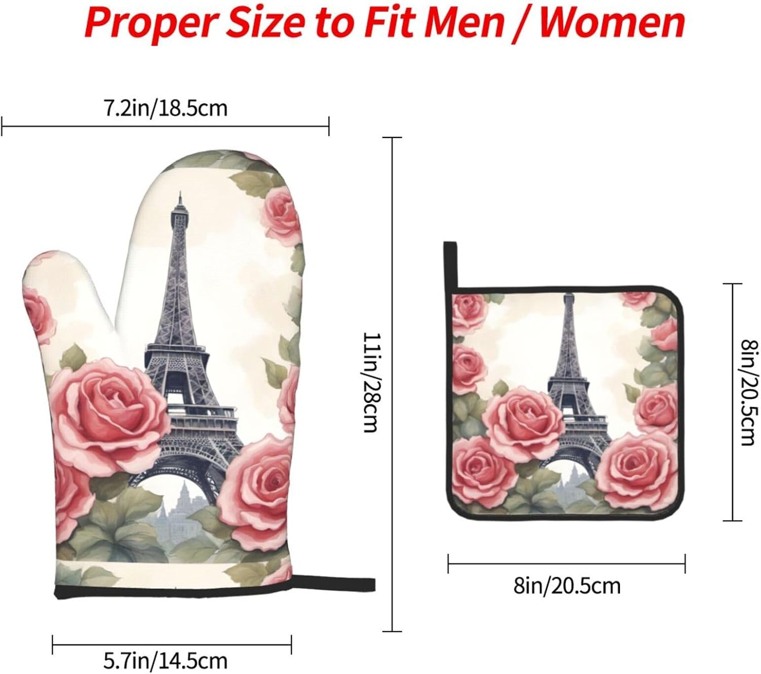 upgrade your kitchen safety with this Eiffel Tower Rose Flower print microwave gloves, oven mitts and pot holders sets. crafted from water repellency polyester and heat-resistant fabric, these kitchen baking three piece set offers reliable protection for hands while handling hot items. the double-layer waterproof design ensures easy cleaning after use. suitable for various cooking scenarios including microwave ovens, conventional ovens, stovetop cooking, and outdoor grilling. the side hanging rope allows convenient storage when not in use. the thick construction provides excellent heat insulation without compromising dexterity. this unisex kitchen essential combines functionality with practical design for everyday cooking needs. the heat-resistant gloves maintain comfort while offering superior protection against burns. an essential addition to any modern kitchen setup