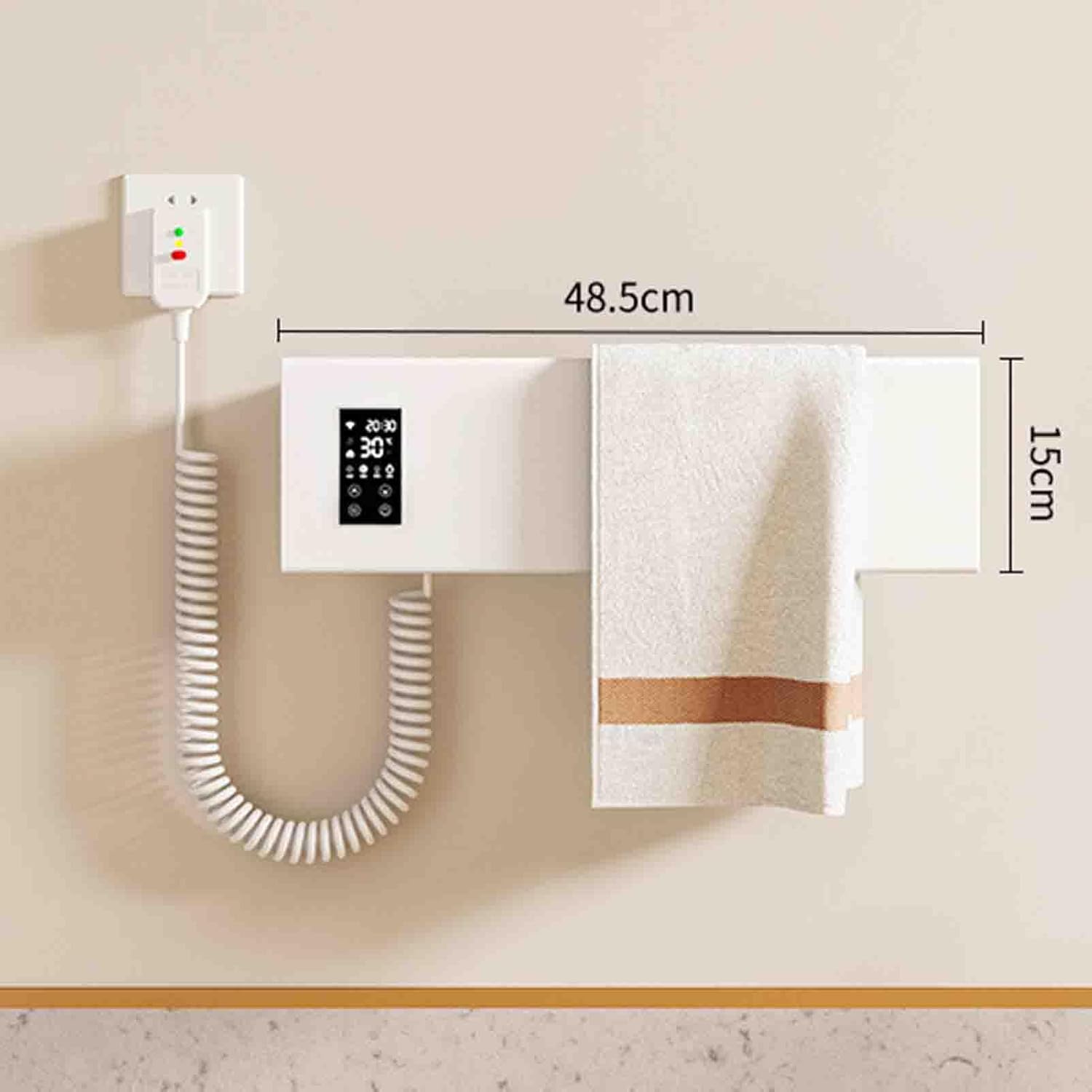 SPECIFICATION Name: Smart Electric Towel Rack Material: Aluminum Alloy Color: White Power: 50W Heating Method: Carbon Fiber Heating Temperature: 30℃~70℃(86℉~158℉) Timing Temperature Adjustment: 1-9 hrs Waterproof Level: IPX4 Surface treatment: Stoving Varnish Installation Method: Drilling Weight Capacity: 10kg(22lbs) Cable Length: 1.5m Dimension: 48.5 × 8 × 15cm / 19.1 × 3.1 × 5.9 inch PACKAGE INCLUDED 1 × Electric Towel Rack