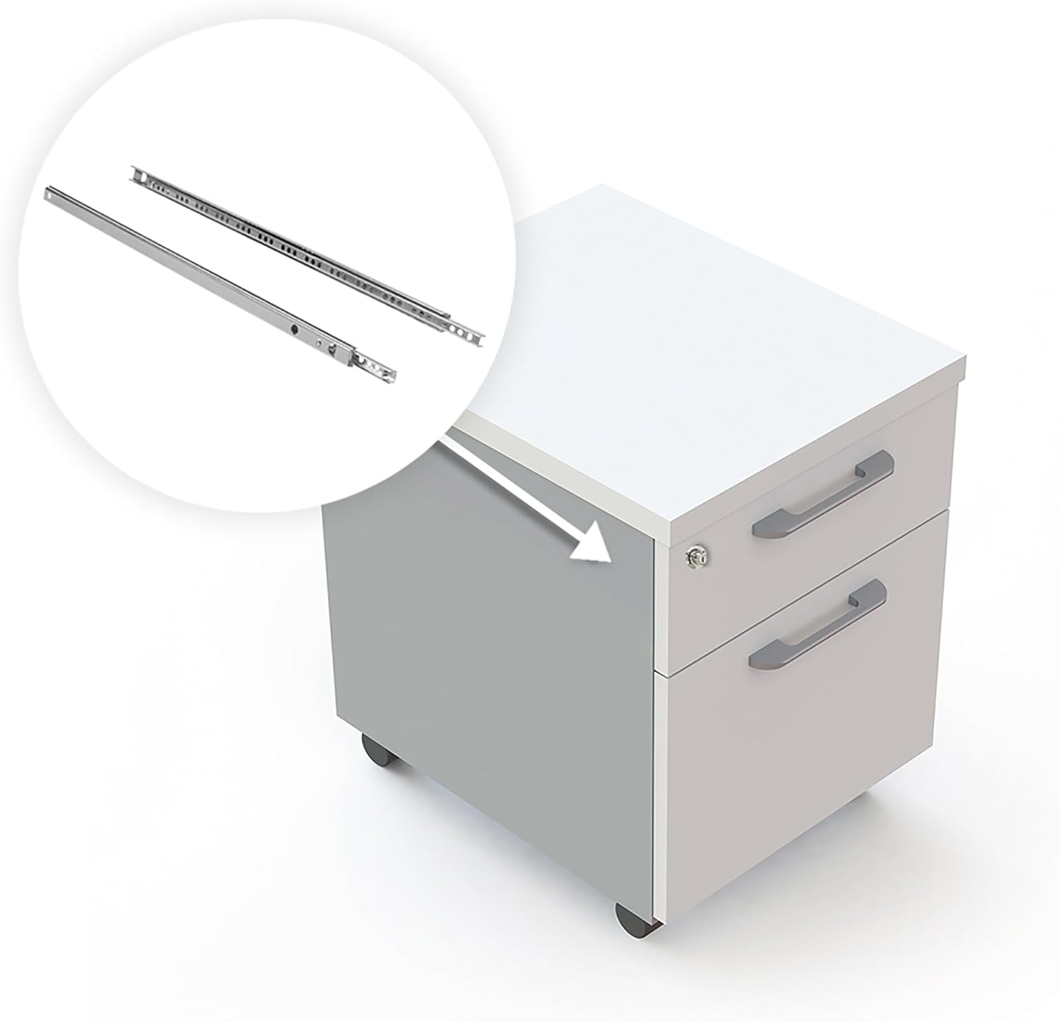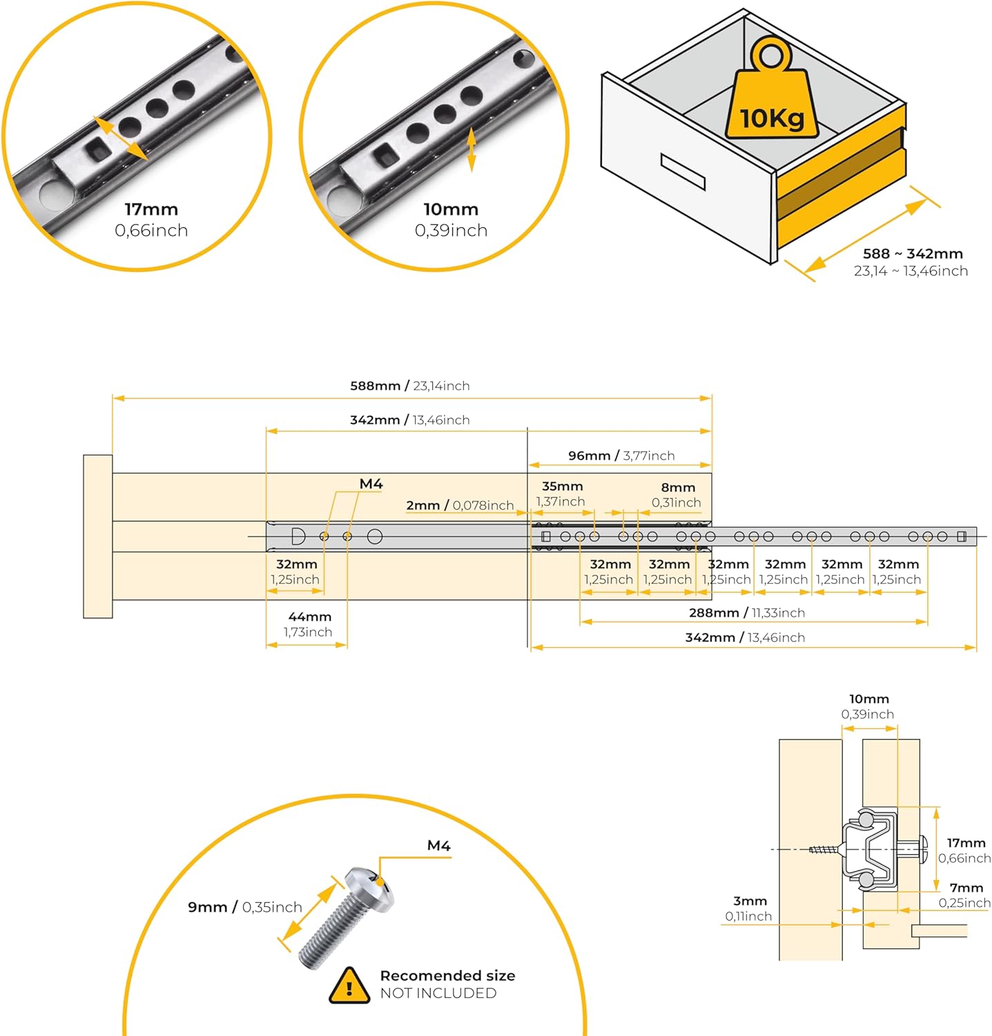 Set of 5 pairs (10pcs) of partial extension ball bearing runners/slides made of zinc plated steel. This kind of slides is suitable for drawers with a 17mm lateral groove. The drawer depth must be between 342-588mm. Maximun load up to 10kg.