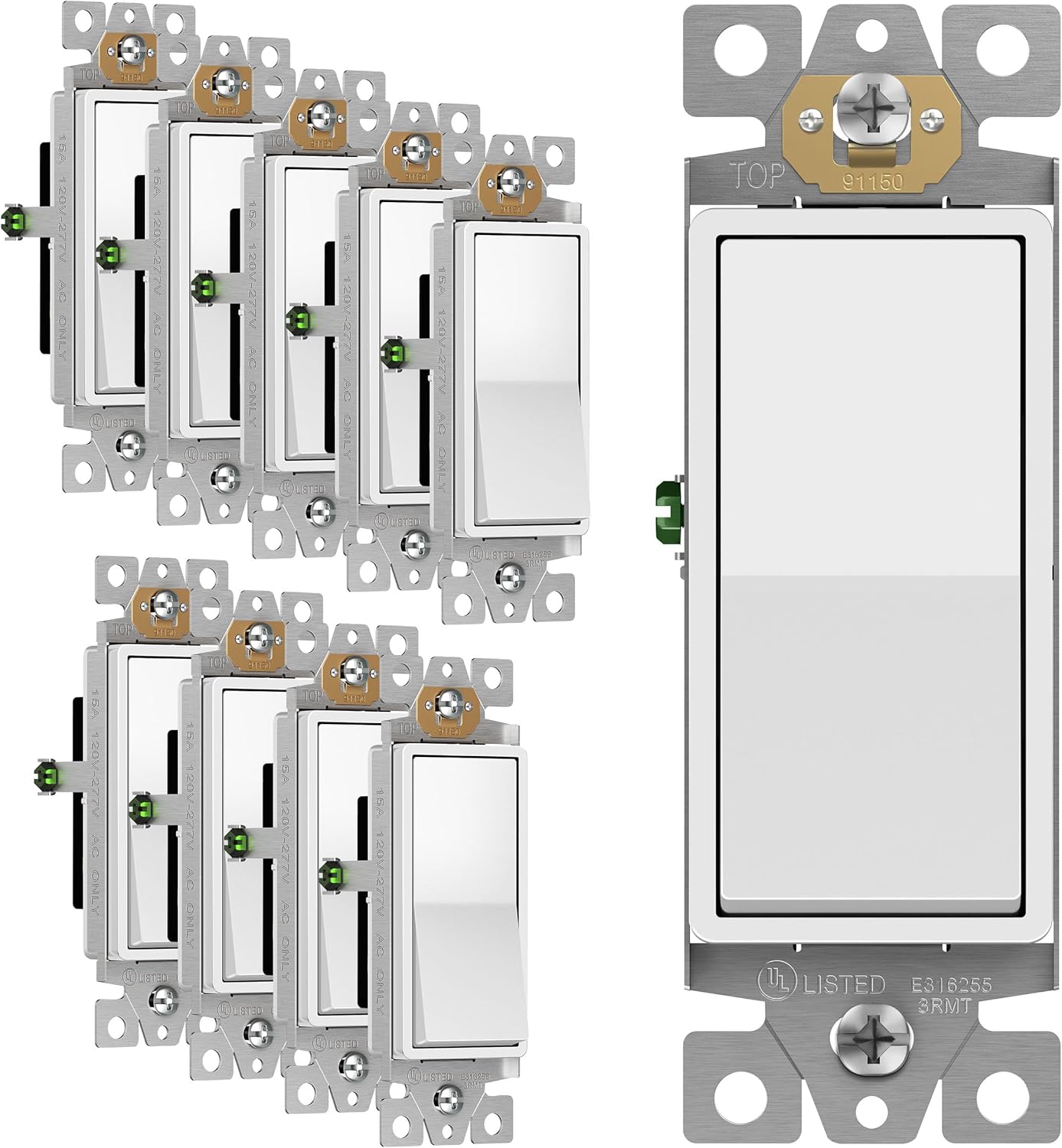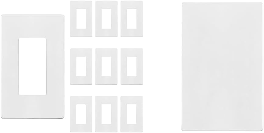 This 10-pack of ENERLITES 2-gang screwless wall plates and 1 ENERLITES 4-gang screwless wall plate form a convenient bundle for childproofing outlets and switches around your home. The 2-gang plates measure 4.68" x 4.73" while the 4-gang plate measures 4.68" x 8.30", providing versatile coverage for multiple receptacles or switches. Both plate types are constructed from durable polycarbonate thermoplastic to withstand impacts and feature a smooth, glossy white finish that resists fading and discoloration over time, even at temperatures above 100°F. The easy snap-on installation protects inquisitive children by covering screws, while the sleek low-profile design blends any wall décor. With feature bullets touting resilience, heat resistance, simple replacement, and an attractive appearance, this essential bundle simplifies childproofing your home's outlets and switches.