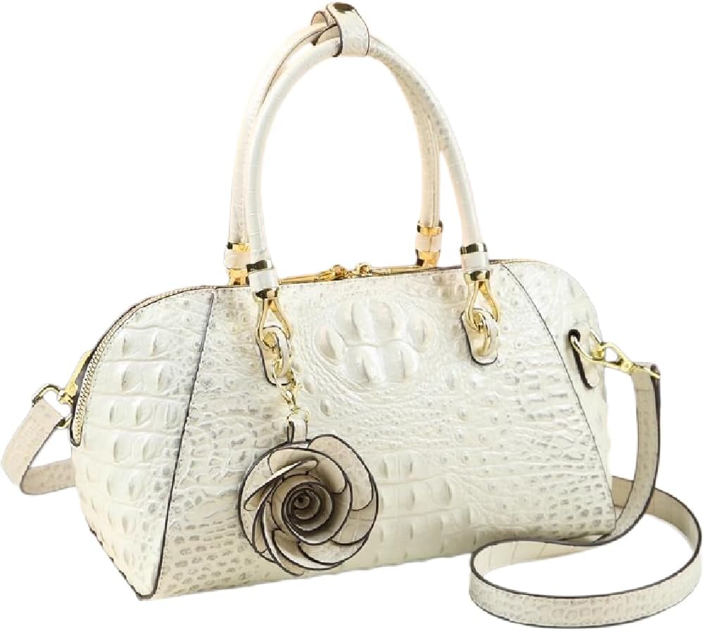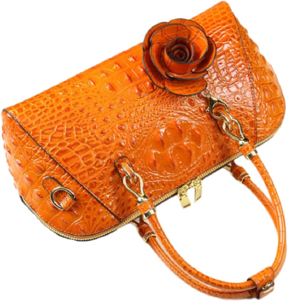 Make a bold fashion statement with this exquisite leather satchel handbag featuring a striking crocodile pattern embossing. The vibrant orange hue and luxurious textured finish create an eye-catching aesthetic that's sure to turn heads. This versatile bag comes with both top handles and an adjustable shoulder strap, offering multiple carrying options to suit your needs. The elegant dome shape is adorned with a beautiful rose flower pendant, adding a romantic touch to its sophisticated design. Premium gold-tone hardware accents complement the leather beautifully, while the spacious interior provides ample room for your daily essentials. The bag's structured silhouette maintains its shape while the crossbody option offers hands-free convenience. Perfect for both daily use and special occasions, this handbag combines style with functionality in a stunning package that elevates any outfit.