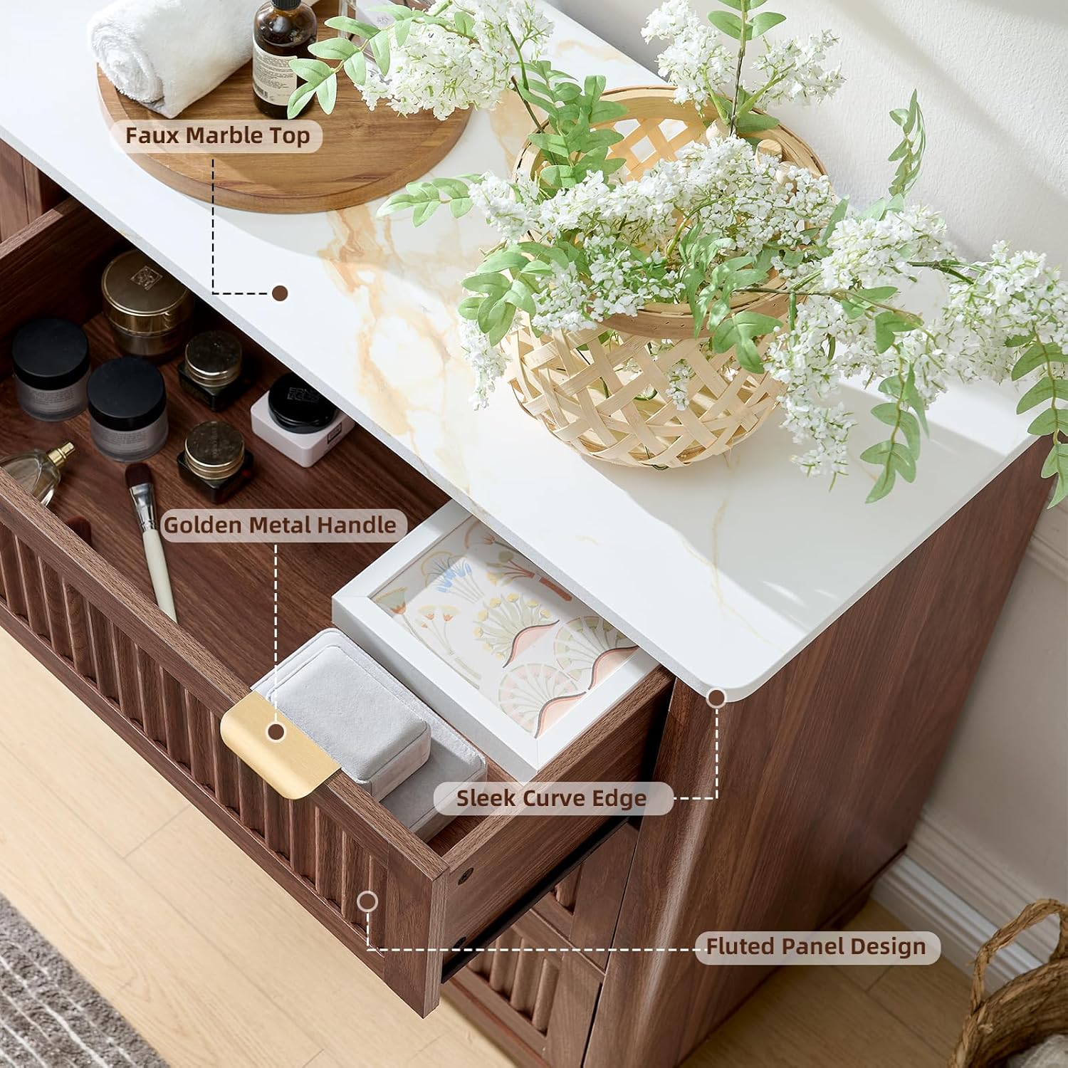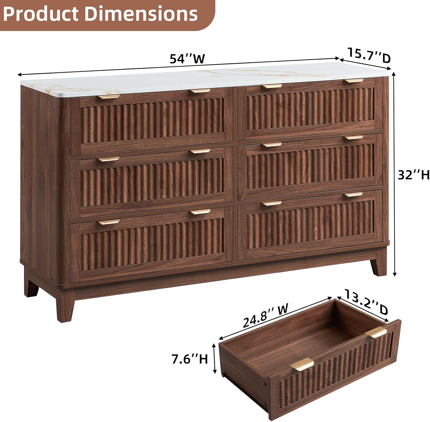 | Additional Features | Faux Marble Top, Blister Molding Tech Surface & Front, Spacious Storage Organizer, Fluted Curved Profile, Walnut Color, 54'' Wide |