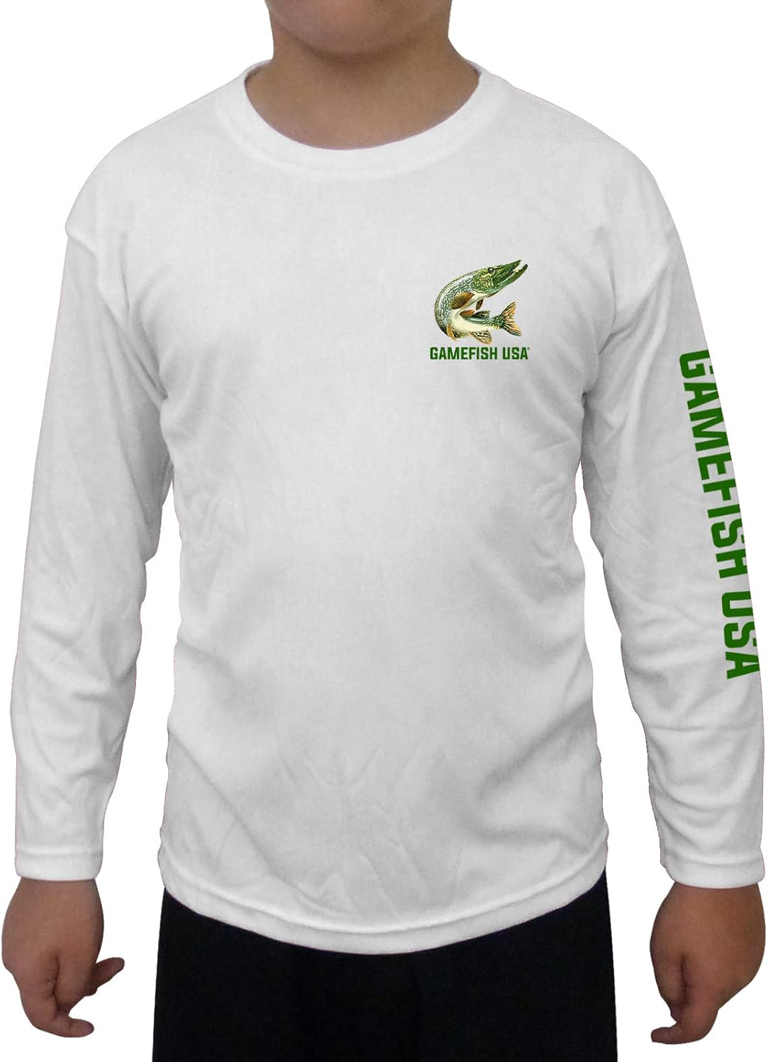 UPF 50+ Microfiber Moisture Wicking Long Sleeve Performance Pike Fishing Shirts, 100% Microfiber Material Performance Fishing Shirt for wicking sweat away, Supersoft Comfortable Feel Performance Fishing Shirt with UPF 50+ Sun Protection for those long fishing days, Unisex Performance Fishing Shirt fits both Boys and Girls, High Quality Graphics that Never Fade Away, GAMEFISH USA Exclusive Performance Fishing Shirts Printed in the USA