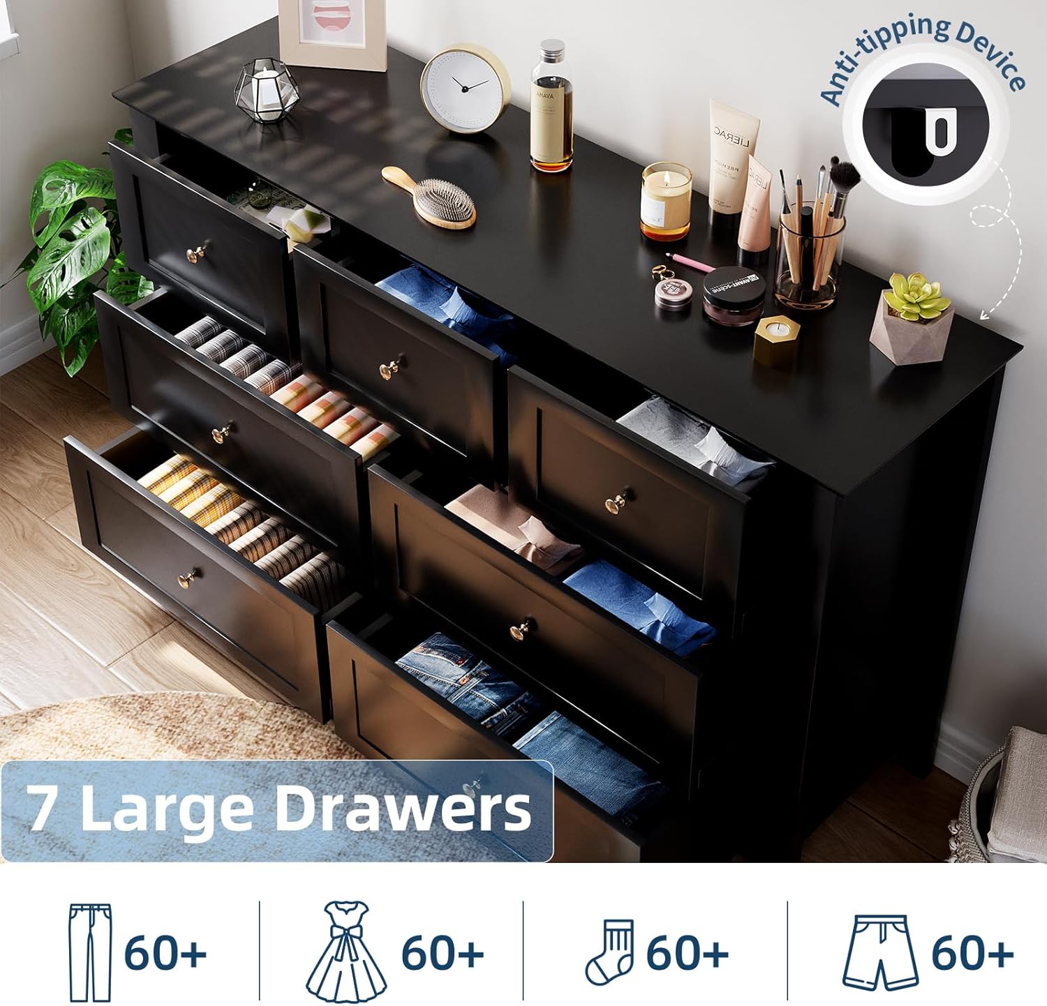 7 Drawers Dresser for Bedroom, 53.9"W Farmhouse Wood Dressers & Chest of Drawers for Clothes, Tall Storage Dressers Organizer with Deep Drawers for Living Room, Closet, Hallway
