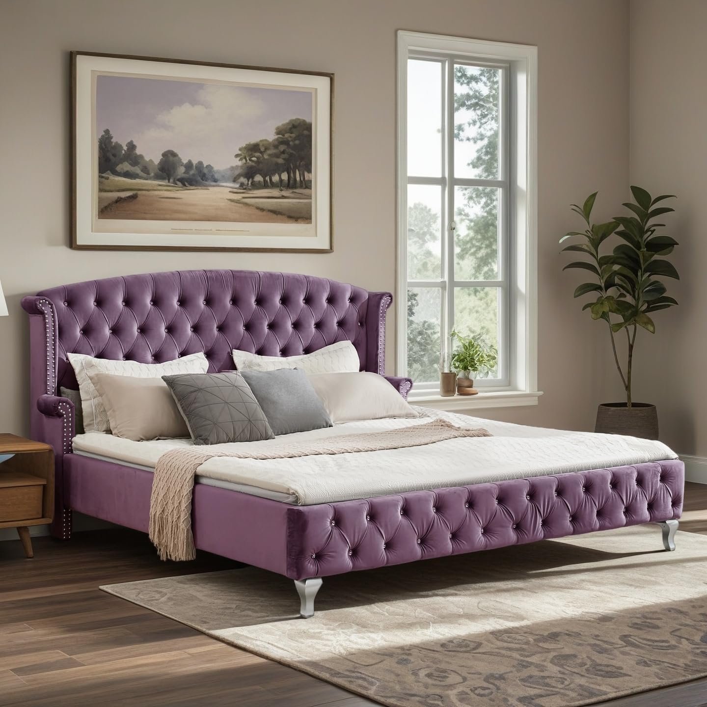 Elegant Velvet Platform Bed with Wingback Design Add a sense of opulence and sophistication to your bedroom with this king-size velvet upholstered bed from GDFStudio. Designed for both comfort and aesthetics, the tall wingback headboard and luxurious diamond tufting offer timeless charm, while the fully padded frame delivers a cozy and quiet sleeping experience. Key FeaturesRefined Wingback Headboard: Featuring a high-profile winged headboard with deep button tufting and stylish nailhead trim, this bed creates a grand focal point in any bedroom. The gently curved edges and velvet texture exude modern luxury.Comfortable and Noise-Free Design: The bed is wrapped in soft-touch velvet fabric and filled with high-density foam. The upholstered design not only enhances comfort while resting but also minimizes noise and impact during sleep.Strong & Stable Platform Frame: Built with durable wooden slats, six central support legs, and a reinforced metal frame, this bed can hold up to 800 lbs. The arched metal feet ensure structural integrity and quiet support for restful nights.Thoughtful and Safe Details: The bed’s winged sides act as flared armrests to support your body when sitting up and eliminate sharp edges, enhancing both safety and convenience. The 6.3" clearance under the bed makes cleaning easy.No Box Spring Required & Easy Assembly: Designed for modern living, this platform bed includes all tools and labeled parts for easy setup. No box spring needed—simply place your mattress on top and enjoy.Product SpecificationsMaterial: Velvet + Wood + MetalColor: PurpleAssembled Dimensions: 88.60"L x 85.30"W x 49.60"HWeight Capacity: 800 lbsBox Spring Needed: NoAssembly Required: Yes