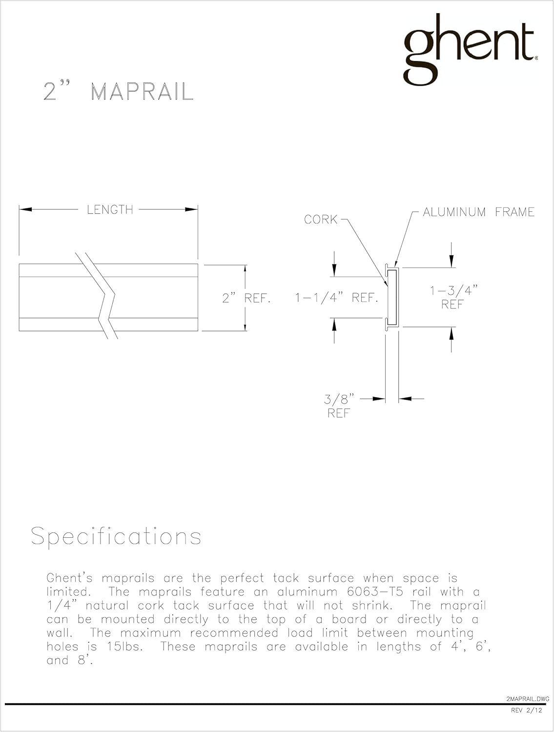 The perfect tack surface when space is limited. Ghent’s Maprails feature an aluminum rail with a natural cork posting strip that mounts easily to the top of a board or to a wall. When added to a chalkboard or whiteboard, these display rails provide an organized way to hang flags, teacher aids, or charts with optional accessories. Made in the USA and TAA compliant.