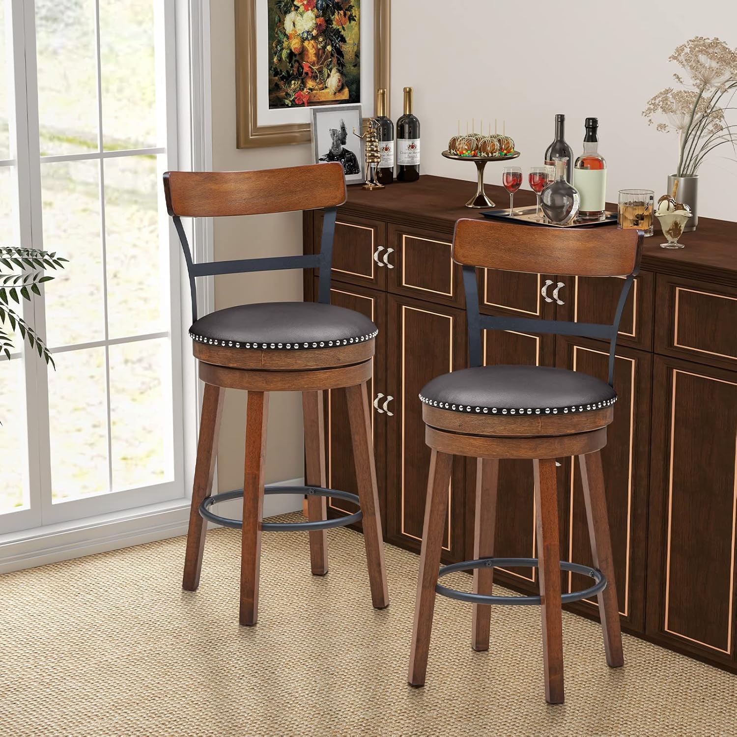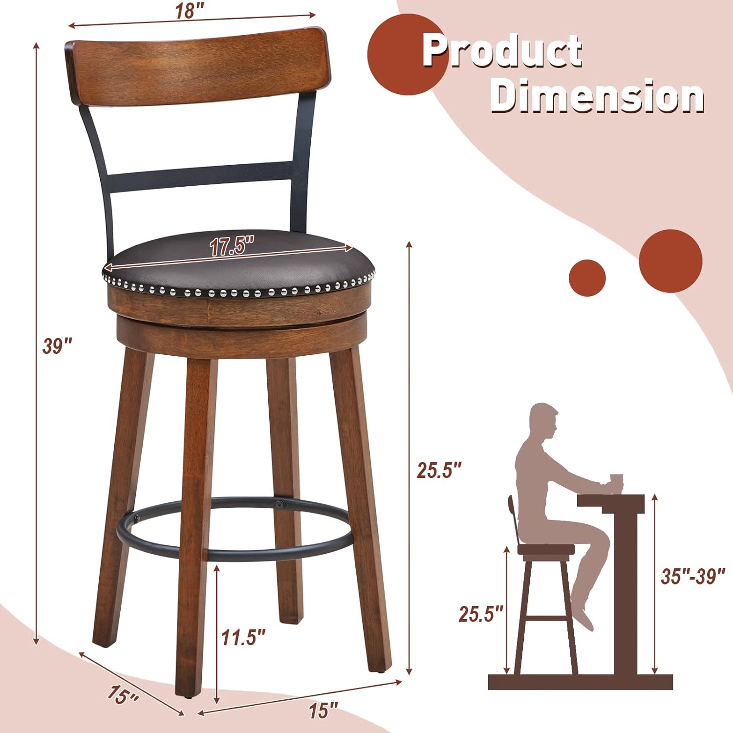 Product DescriptionDescription:Giantex 360° swivel bar stools are comfortable to sit on and convenient to use!Features:Easy to assemble and cleanFreely switch directions with 360° swivel seatsCushioned seats for optimal comfortLean against the curved backrests for extra cozinessRest your feet on the round footrests for complete relaxationKeep these stools stable with solid rubber wood legs25.5"seat heights for 35"-39"bar tables30.5" seat heights for 40"-43" bar tablesSuitable for kitchen, bar, café and moreSpecification:Size: 25.5" Counter HeightDimension of Each Stool: 18" x 20.5" x 39" (L x W x H)Seat Height from the Ground: 25.5"Total Net Weight: 42 lbsSize: 30.5" Bar HeightDimension of Each Stool: 18" x 20.5" x 43.5" (L x W x H)Seat Height from the Ground: 30.5"Total Net Weight: 44 lbsColor: BrownMaterial: Rubber Wood, PVC Leather, SpongeWeight Capacity of Each Stool: 250 lbsPackage Includes:2 x Barstools1 x Instruction
