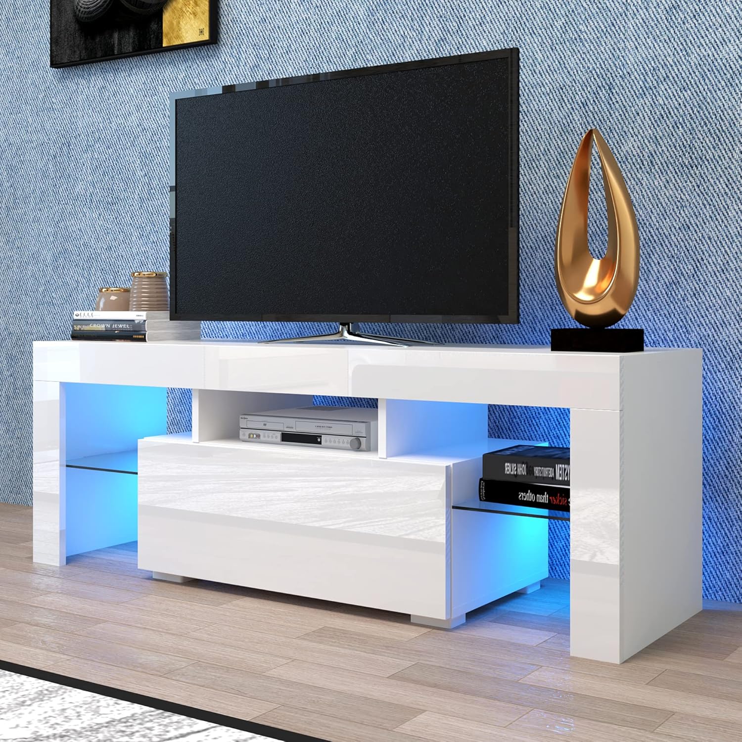 Morden TV Stand with LED Lights,high glossy front TV Cabinet,can be assembled in Lounge Room, Living Room or BedroomThis TV stand with LED comes with 16 RGB LED BACKLIGHT, 4 LIGHT MODE & BRIGHTNESS ADJUSTMENTS. Equipped with REMOTE CONTROL makes changes of light ever easyFeaturing a modern and simple design, this TV Stand with Led fits with different room theme, and the LED lights could create different atmosphere for your roomMade of P2 grade particleboard, this TV stand is scratch proof and waterproof, and easy to maintain.Clear instruction and necessary accessories are included in the package. The simple structure of the TV stand makes it super easy to assemble If you have any questions about our product, please do not hesitate to contact us Applicable scene:Bedroom, Lounge room,living room,etc