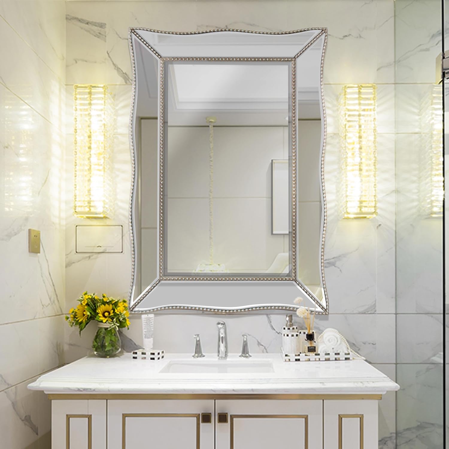 Transform your home with our luxurious vintage bathroom mirror, adding timeless elegance to any room. This stunning beaded mirror features a sophisticated scallop mirror design with a champagne silver frame, blending modern charm with vintage style. Its elegant beveled edge and intricate beaded details make it stand out, whether used as a bathroom vanity mirror for over sink areas or an exquisite bedroom mirror. Not just a functional restroom mirror, this piece enhances your decor as a beautiful vanity wall mirror. Its versatile hanging options allow it to be displayed vertically or horizontally, perfect for bedroom mirrors for wall over dresser or as a striking foyer mirror. Built to last, our wall vanity mirror combines durability with elegance, ensuring it remains a stylish addition to your home for years to come. This glass framed mirror fits seamlessly in any setting, whether you’re updating your bathroom mirror decor, enhancing your living room with a silver wall mirror, or adding a touch of class with a beveled mirror for office decor. Its timeless design makes it an excellent choice for antique mirrors or unique bathroom mirrors, providing a classic yet contemporary look that blends effortlessly with any decor style. Easy to install, our silver bathroom mirror can be used as a wall mount vanity mirror, making it a hassle-free addition to your home. Whether you’re looking for bathroom vanity mirrors, accent mirrors for wall decor, or unique mirrors for wall, this venetian mirror brings beauty and functionality to any space. Its durable construction ensures it will be a lasting addition to your home decor, perfect for mirrors for bathroom or any room needing sophistication. Upgrade your home with this exquisite beaded mirror and experience the perfect blend of style and practicality. With its timeless style and benefits, our vintage bathroom mirror is the perfect addition to any room, providing elegance and sophistication wherever it’s placed.