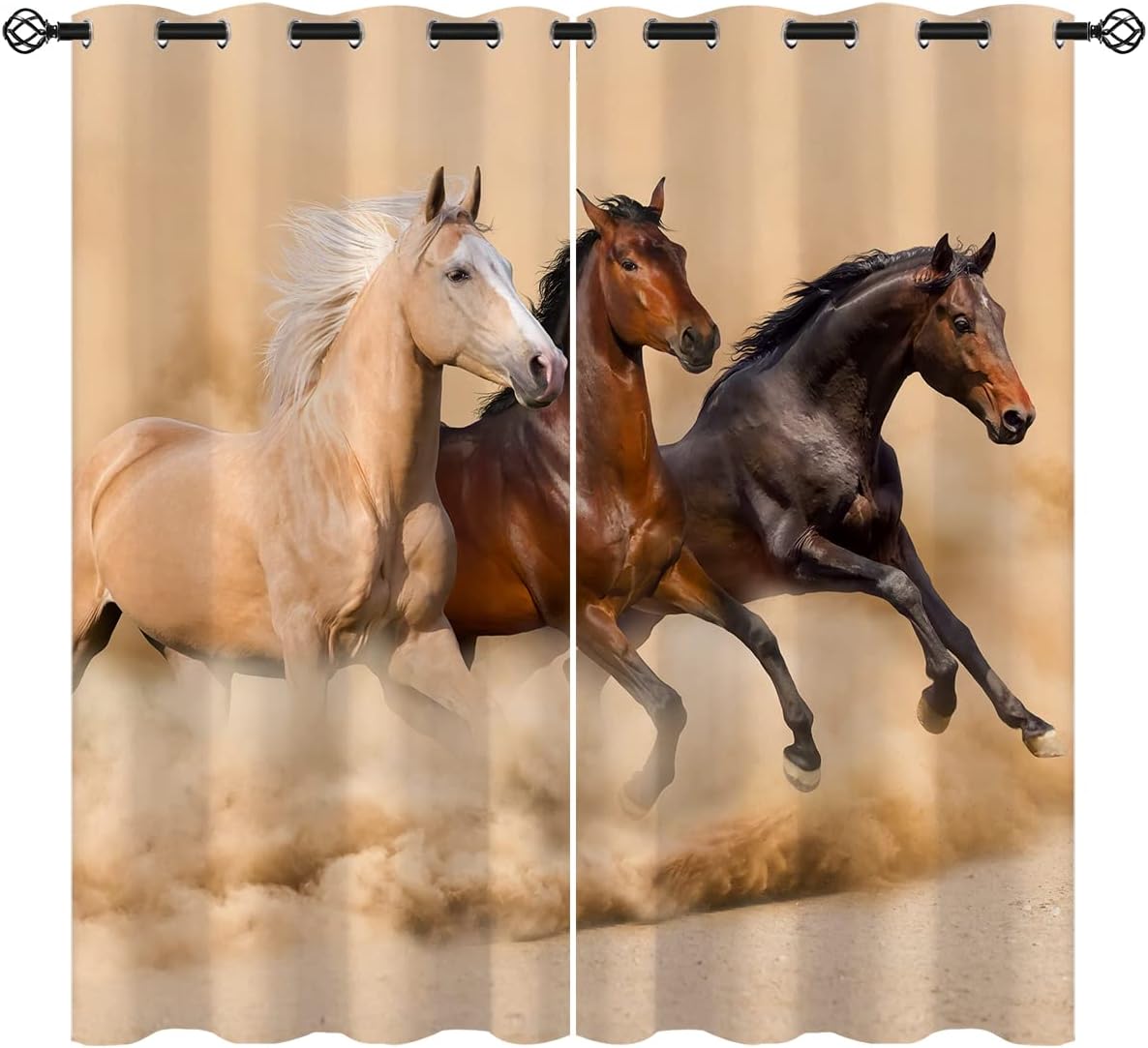 These print curtains are perfect for Living room, bedroom, kids room, kitchen, yard, patio, parlor, sliding door with Horse,Desert Wild Animals Running Brown pattern.- Unique design:· Save energy costs by insulating against heat and cold.· Reduce noises from busy streets and high-traffic areas.· Protect furniture from sun damage and fading.· Provides complete privacy when needed· Perfect for any bedroom, office kids room and living room.- Package Included:· Blackout window curtains 2 Pcs set ( two panels).- Material:· Our Blackout Curtain Liners are crafted from a durable soft and thick triple weaved blackout fabric which can block out sunlight and UV rays. The darker color of the fabric, the more light it can block.- Easy Care Instructions:· Machine washable in cold water· Do not bleach.· tumble dry on low· low temperature ironing- Notes:· For your curtains to be more perfect, please choose a size 5-10 Inch larger than the actual window width.· here may be slight differences in colors on different displays. If you have any questions about the product, please feel free to contact us.