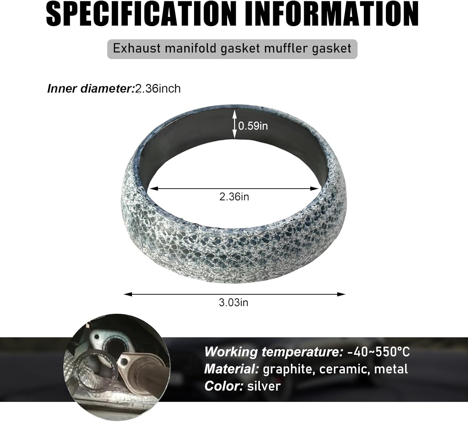 Specification:Material: Ceramics, Metal, GraphiteQuantity: 1/ 2 PCSColor: SilverWeight: 36 gInner Diameter: 45mm/ 48mm/ 54mm/ 60mm/ 65mmSize: 2.36 × 2.36 × 0.63/ 2.52 × 2.52 × 0.67/ 2.71 × 2.71 × 0.62/ 3.03 × 3.03 × 0.59/ 3.23 × 3.23 × 0.67 inchesFeature: Practical, Rustproof, LeakproofWorking Temperature: -40°C to 550°CFit Type: Universal FitWould you like to consider our exhaust flange gasket?-Offered in various size options, you'll find the ideal fit for your specific exhaust system.-Our gasket's high-temperature resistance and durable construction make you feel at ease regarding your vehicle's performance.-The gasket can be applied to cars, RVs, SUVs, trucks and many other vehicles, making it a versatile choice for all your exhaust sealing needs.