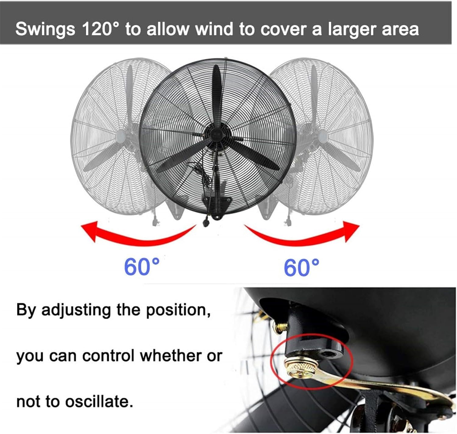 The Industrial Wall Mounted Fan is the perfect solution for cooling large spaces efficiently and effectively. Whether you’re in a warehouse, greenhouse, shop, or patio, this heavy-duty air fan provides powerful airflow that can be adjusted with three different air volume modes (low, medium). The fan is designed with silent operation, allowing it to cool down spaces without producing disruptive noise, making it ideal for commercial and residential environments where quiet operation is important. The 120° oscillation that air circulates evenly across a wide area, reaching all corners of the space, while the durable metal construction promises long-term reliability and sturdiness. The 55cm/21" fan size makes it perfect for medium to large spaces, and the wall-mounted design helps save valuable floor space. Install it on the wall for efficient and continuous cooling, and enjoy a comfortable environment wherever you need it. Perfect for outdoor and indoor use, this fan is your go-to solution for all your cooling needs.
