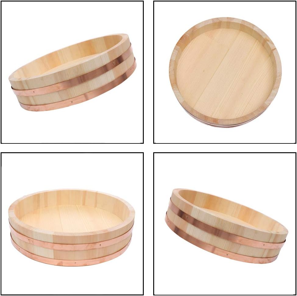 Made of high quality material, this Wooden Mixing Tub is durable and practical for long lasting use, suitable for home, kitchen, restaurant etc. Wood bucket shape design, it not only can be used as a rice mix bucket, but also can be used as a Sushi bucket.Features- Made from high quality material, durable and practical.- Wood bucket shape design, it not only can be used as a rice mix bucket, but also can be used as a Sushi bucket.- Suitable for home, kitchen, restaurant etc.- Perfect for cooking, such as Japanese sushi and Korean rice mix.- Wonderful gift for your friends and families.Specification:-Size: 12 Sizes To Choices-Color: Wood Color-Material: White Pine Wood + Copper Bands-Technology:Color Glaze-Shape:Round-Weight: 0.5kg - 6.5kg /1.1Lbs - 14.3Lbs How To Care?1. Because the wood itself will expand and contract with heat, it should not be directly exposed to the sun or exposed to cold wind. If it is not used for a long time for more than 2 months, the sushi barrel can be soaked and sealed with a large plastic bag to prevent the air from taking away moisture;2. It is best to put a little water in it at ordinary times to make it absorb water and keep the wood saturated and moist;3. If the sushi barrel has been filled with meat or oily food, use a trace detergent and hot water to scrub it;4. Pack raw and cooked food separately to avoid cross-growing food bacteria.Package List:1 x Wooden Mixing Bowl Tub