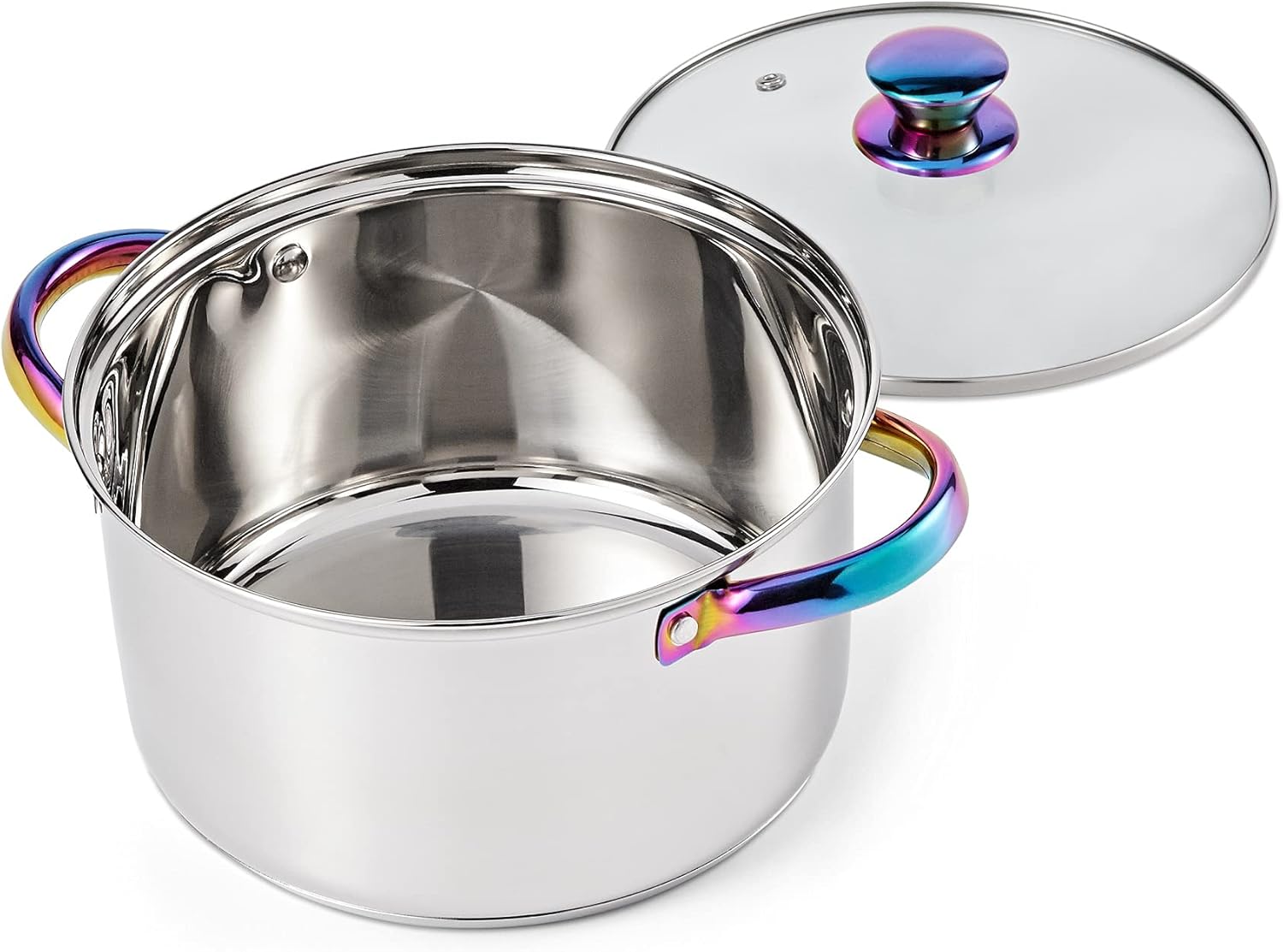 Crafted from beautiful rainbowhued stainless steel, the 20Piece Iridescent Stainless Steel Cookware and Utensil Set has everything you need to set up your kitchen and start making delicious meals at home. This cheerful, colorful set includes an 8.5inch sauté pan, a 1quart saucepan with glass lid, a 2quart saucepan with glass lid, a 4quart Dutch oven with glass lid, slotted turner, fork, solid spoon, slotted spoon, ladle, set of 4 measuring cups, and set of 4 measuring spoons. These pots and pans are oven safe to 450 degrees Fahrenheit so you can roast or braise foods in the oven as well as cook favorite recipes on the stovetop. 20Piece Iridescent Stainless Steel Cookware and Utensil Set is dishwasher safe for easy cleanup.Imported.Dishwasher safe for easy cleanup wash before first use.Made from iridescent stainless steel that has a unique and colorful rainbow effect.Pots and pans are oven safe to 450 degrees Fahrenheit for added cooking versatility.Tempered glass lids with iridescent knob handles allow you to see food as you are cooking.Easytogrip handles are riveted for durability and have hanging holes for pot rack storage.Great starter set for students, young adults, and people moving into new apartments or homes.20piece cookware set includes essential pots, pans, utensils, and accessories to set up your kitchen.Ideal set for cooking everyday meals including meats, vegetables, rice, beans, pasta, soup, eggs, and other family favorites.