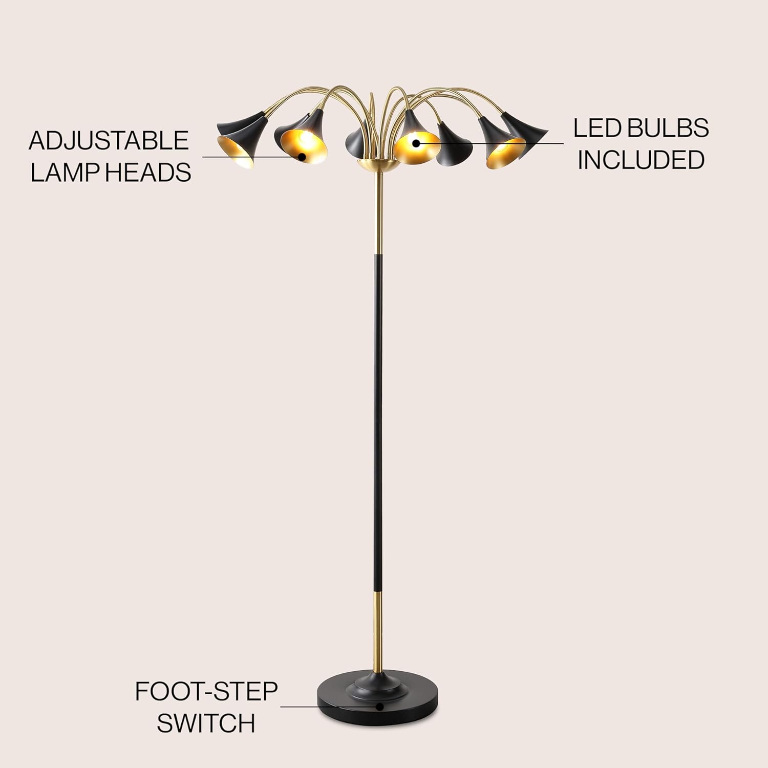 Whether your style is mid-century modern or vintage glam, you'll love this floor lamp's groovy adjustable design. The ten individual shades can be swiveled and bent to create a unique look. Warm LED bulbs are ideal for both reading and accent lighting.