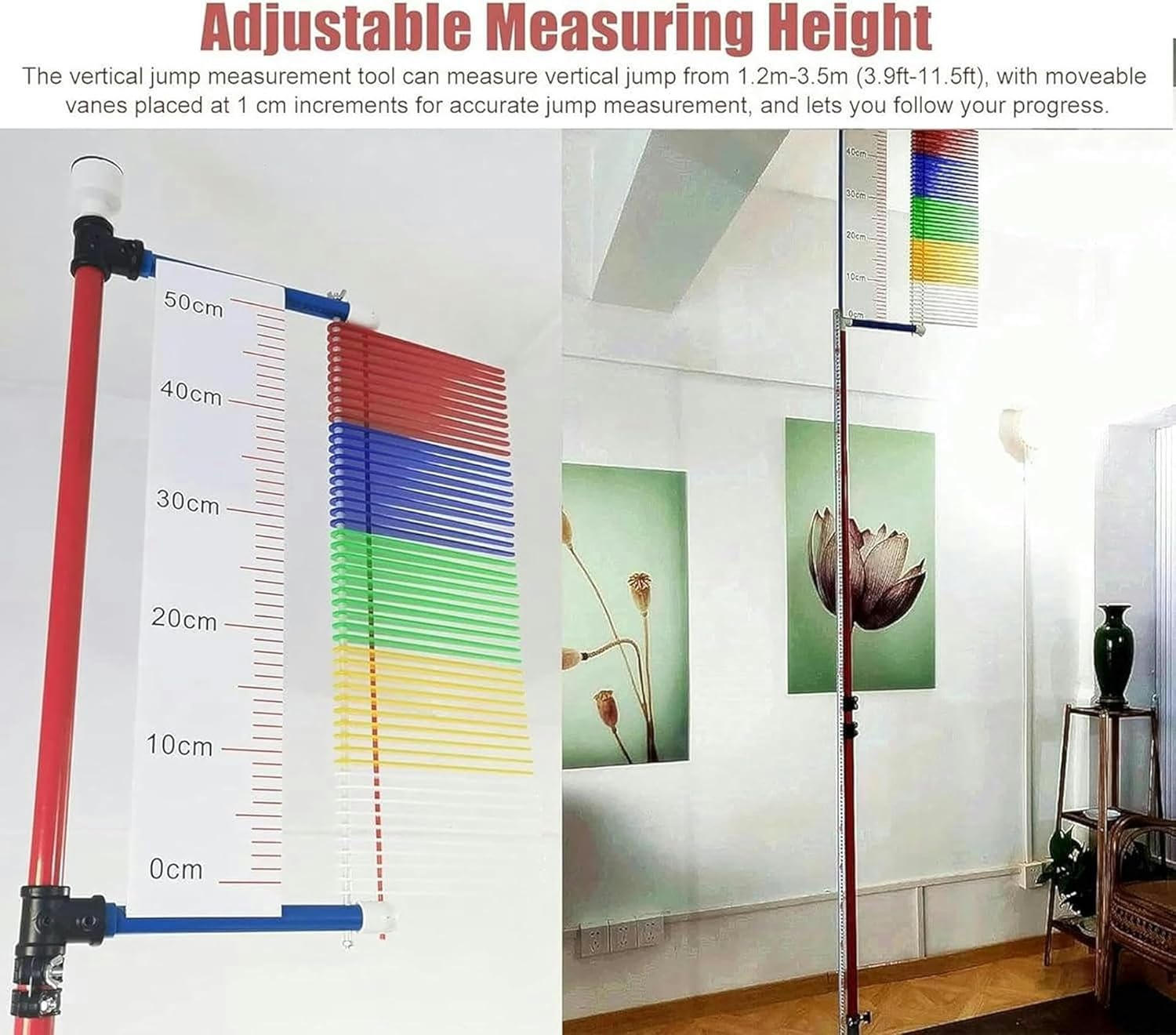 Floor Standing High Jump Training Equipment:Introducing our Vertical Jump Tester, the ideal solution for athletes and sports enthusiasts looking to enhance their performance. This essential tool measures vertical jumps accurately, allowing you to track your progress over time. Whether you're training for basketball, volleyball, soccer, high jump, or long jump, this versatile tester caters to athletes of all ages, helping you reach new heights in your training routine.Crafted from durable materials, our Vertical Jump Tester features a robust metal pole combined with a lightweight plastic vane. The adjustable height ranges from 1.2m to 3.5m (3.9ft to 11.5ft), making it suitable for various training environments. Its stability ensures precise measurements without the worry of shaking or tipping during use. The brightly colored vanes enhance visibility, enabling you to read measurements easily and accurately.Assembly is a breeze, so you can set up your testing station quickly and focus on improving your jump. Whether you're a coach guiding your team or an athlete determined to break your personal records, this jump tester is a valuable addition to your training equipment.Please note that slight color variations may occur due to lighting and personal perception. Measurement errors typically range from 0.5 to 1 cm, which is considered acceptable. We stand by our product quality and are committed to providing excellent customer service. For any inquiries, please reach out to us via email, and we will be happy to assist you.Transform your training regimen and elevate your performance with our Vertical Jump Tester today!