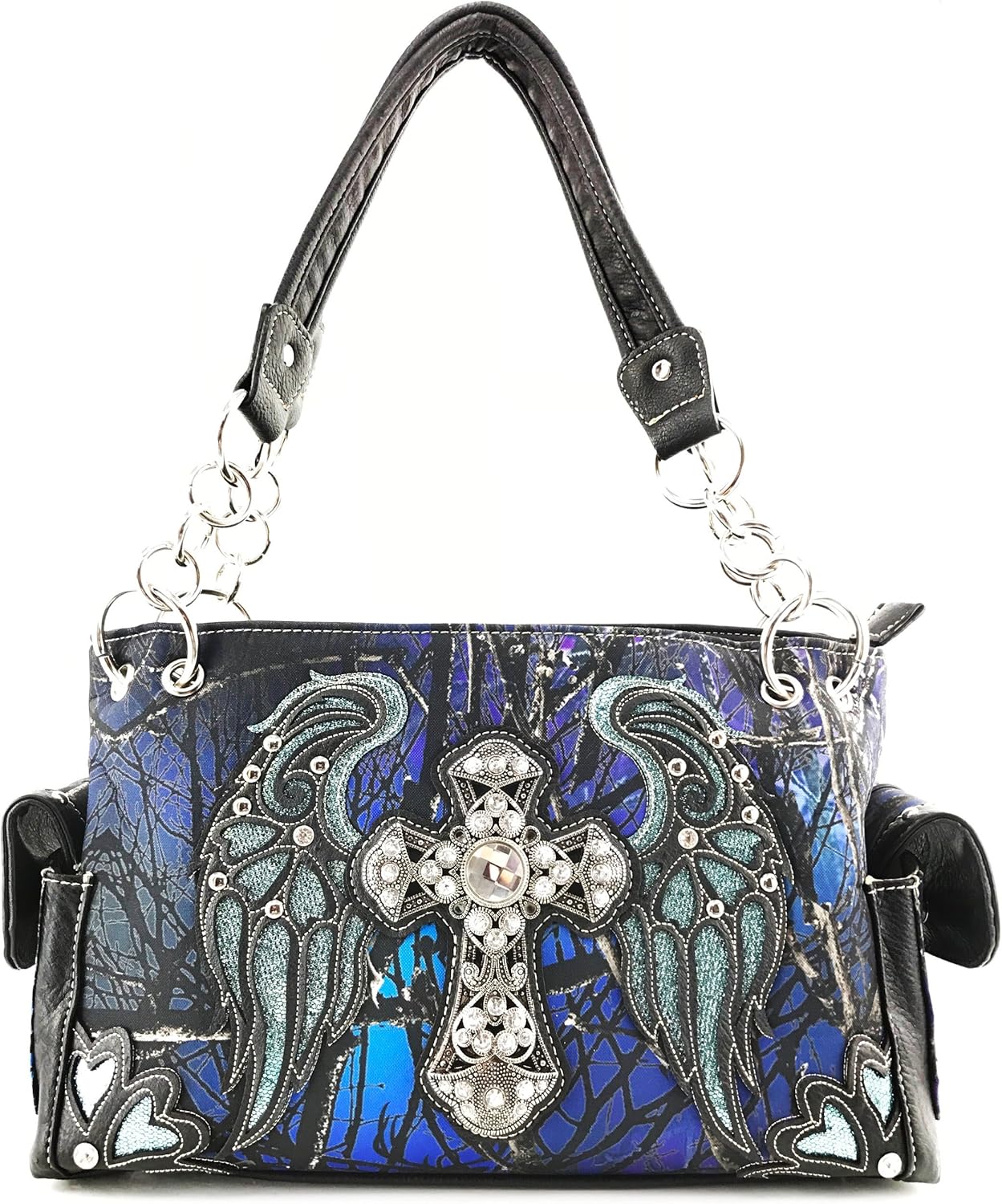 A beautiful western laser cut gleaming cross angelic wing design. Comes in shoulder handbag, wallet, messenger. Buy them all to match! Features Top Zipper Closure, Interior Middle Zipper Divider Pocket with Multiple Interior Size Pockets, Flap Magnetic Closure Pockets on Two Sides, Back Phone Slot and Zipper Concealed Carry Pocket.