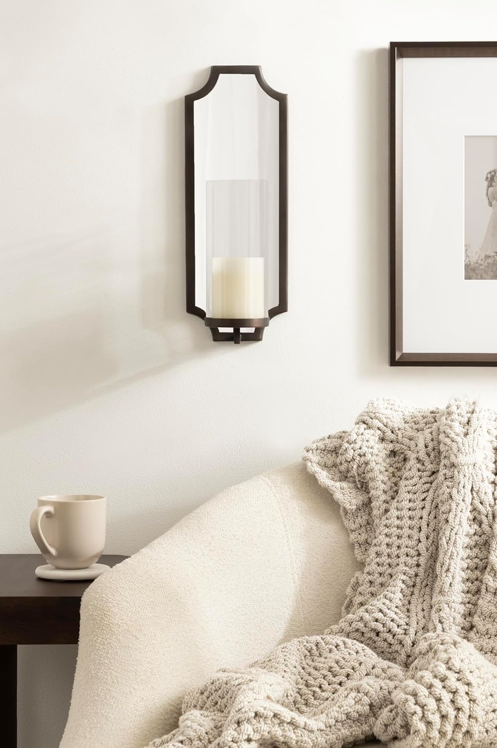 Elevate your home decor with the Kate and Laurel Ciel mirrored wall sconce. Crafted with meticulous attention to detail, the sconce features a durable metal construction with a classic bronze finish, imparting a touch of warmth to any room. The contemporary scalloped candle holder not only serves as a stylish accent but also offers a practical solution for enhancing the ambiance with flameless candles. Behind the candle holder is an octagonal mirror that reflects more light throughout your home. Another highlight of this sconce is the removable glass cylinder, thoughtfully designed to beautifully showcase your favorite candles. Whether adorning your living room, bedroom, or hallway, the soft glow emanating through the glass cylinder creates a mesmerizing visual impact and a hint of light. The overall dimensions of this versatile candle sconce are 6 inches wide by 5 inches deep by 16 inches tall. This timeless wall sconce seamlessly combines form and function, making it an ideal choice for those who appreciate a harmonious blend of style and practicality in their home decor. Transform your space with this versatile wall sconce, effortlessly bridging the gap between traditional and contemporary aesthetics.