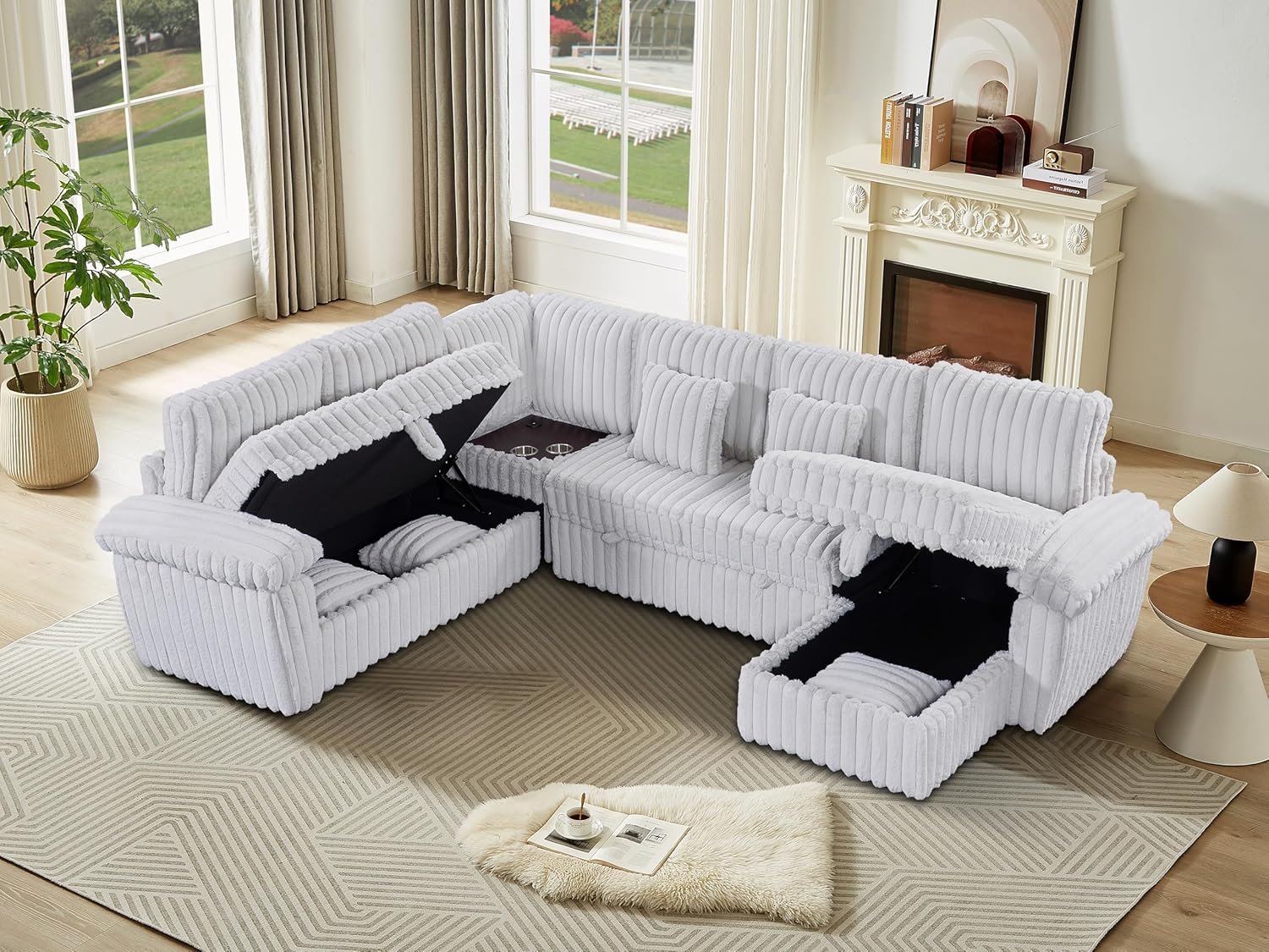 110" U-Shaped Corduroy Sectional Sofa with Storage Chaise, Pull-Out Bed & Coffee Table, Super Soft Convertible Sleeper Couch with Cup Holder and USB Port, Light GrayProduct DetailsMain Color: Light GrayMain Material: CorduroyFiller: High-Density Foam + CottonFrame Material: Eucalyptus WoodProduct Style: ContemporaryUse Case: Living Room, Apartment, Lounge Area, Guest RoomSectional Shape: U-Shaped Modular DesignArm Style: Pillow Top ArmsBack Style: Cushion BackSeat Plushness: SoftAbrasion Rating: Medium DutyCountry of Origin: ChinaProduct FeaturesUpgraded Corduroy Fabric: Crafted from premium corduroy, this U-shaped sectional offers an irresistibly soft texture with a subtle sheen. The breathable and durable fabric adds warmth and sophistication to your living space while ensuring long-term comfort and style.Convertible Sleeper Function: Easily transform your sectional sofa into a spacious sleeper bed with the pull-out function. Perfect for movie nights or accommodating overnight guests, the sofa provides an effortless transition between seating and sleeping modes.Hidden Storage & Smart Table Design: The chaise lounge and two-seater sections include hidden storage compartments ideal for bedding, blankets, or personal items. The integrated corner coffee table features built-in USB ports and dual cup holders, combining practicality with modern convenience.Durable & Supportive Build: Supported by a solid eucalyptus wood frame and high-density foam cushions, this sofa delivers lasting comfort and stability. The pillow-top armrests and plush back cushions offer a relaxing experience after a long day.Easy Assembly & Extra Comfort: Designed for quick setup with all tools and instructions included. Comes with 4 matching pillows for enhanced coziness—perfect for lounging, entertaining, or family gatherings.DescriptionUpgrade your living room with this 110" U-Shaped Corduroy Sectional Sofa in Light Gray. Combining modern design with everyday practicality, it features a pull-out sleeper bed, spacious hidden storage, and a multifunctional coffee table with USB ports and cup holders. Wrapped in plush corduroy fabric and supported by a solid eucalyptus wood frame, this sofa delivers exceptional comfort and durability—ideal for living rooms, apartments, and family spaces.NoticesAssembly required; all hardware and tools included.Color may vary slightly due to lighting or monitor differences.Clean with a dry or semi-wet cloth; avoid scrubbing with brushes to protect the corduroy fabric.