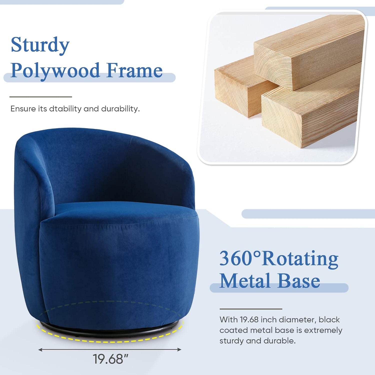 Features- Soft velvet upholstery with high density foam-cushioning- Strong metal base allows to swivel 360 degrees smoothly- Ergonomical curved backrest with sloped amrest- Perfect for living room, bedroom, officeSpecificationsProduct Name: Swivel Accent ChairOverall Size: 25.6" L × 25.6" W × 27.56" HProduct Weight: 26.4 lbsPackage Size: 25.4" L × 25.4" W × 26.38" HPackage Weight: 30.8 lbsUpholstery Material: VelvetFiller: FoamFrame Material: WoodBase: Metal360 Degree Swivel: YesAssmebly Required: YesProduct Care: Spot wipe clean with a soft, dry clothWeight Capacity: 250 lbs