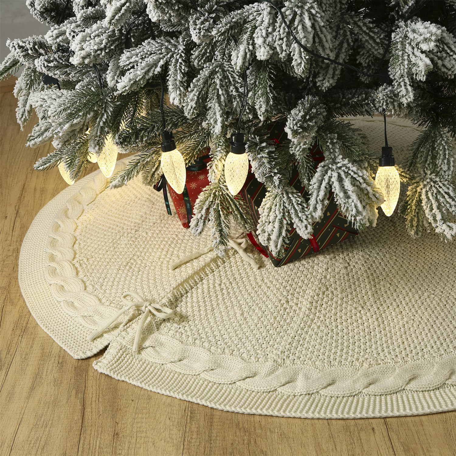 The ivory tree skirt is designed with three ties at the opening to ensure a secure and snug fit under the tree. No more worries about it shifting or sliding. Ideal Christmas tree decorations to decorate your Christmas tree, home, living room, bedroom, wedding, garden. Perfect gifts for men, women, family, kids and everyone you love.
