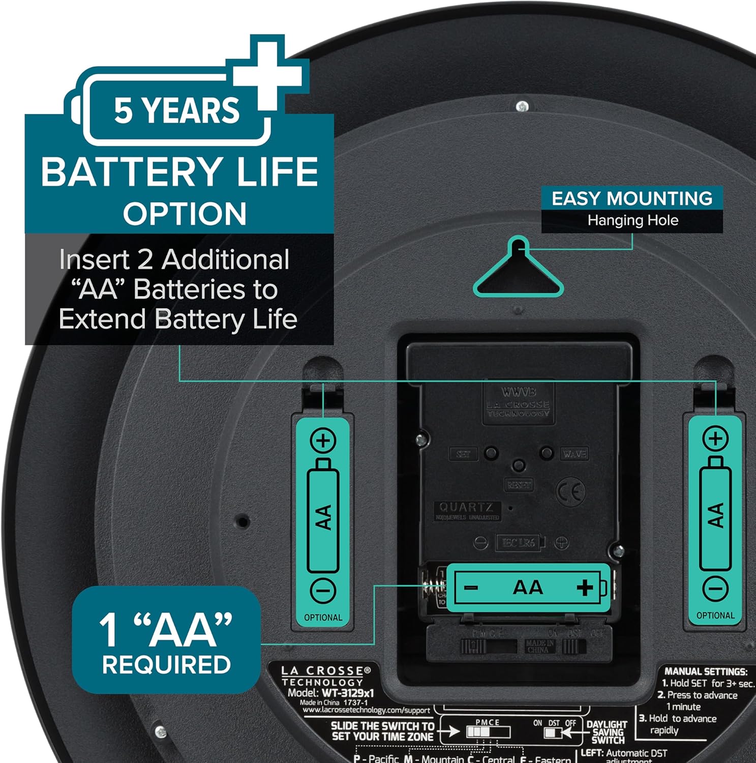 Remove the hassle and worry if your clock's time is correct, with La Crosse Technology's Atomic Wall Clock. This 12" self-setting, radio-controlled analog clock automatically sets to the exact time and keeps it accurate to the second. It has four time zone settings, and it automatically updates for Daylight Saving Time (on/off option). Operating this wall clock is easy. Simply insert one AA alkaline battery into the clock. After the signal is received, press the Time Zone button to set your time zone. Use the manual reset button if you need to readjust the clock, if you are outside the 2,000 mile distance from the signal (located in Fort Collins, CO.) Convenient extra battery compartment for two additional AA batteries to extend the clock's power up to 5 years. This convenient wall clock has a stylish silver frame and an easy-to-read analog face. Its simple style will complement almost any room.