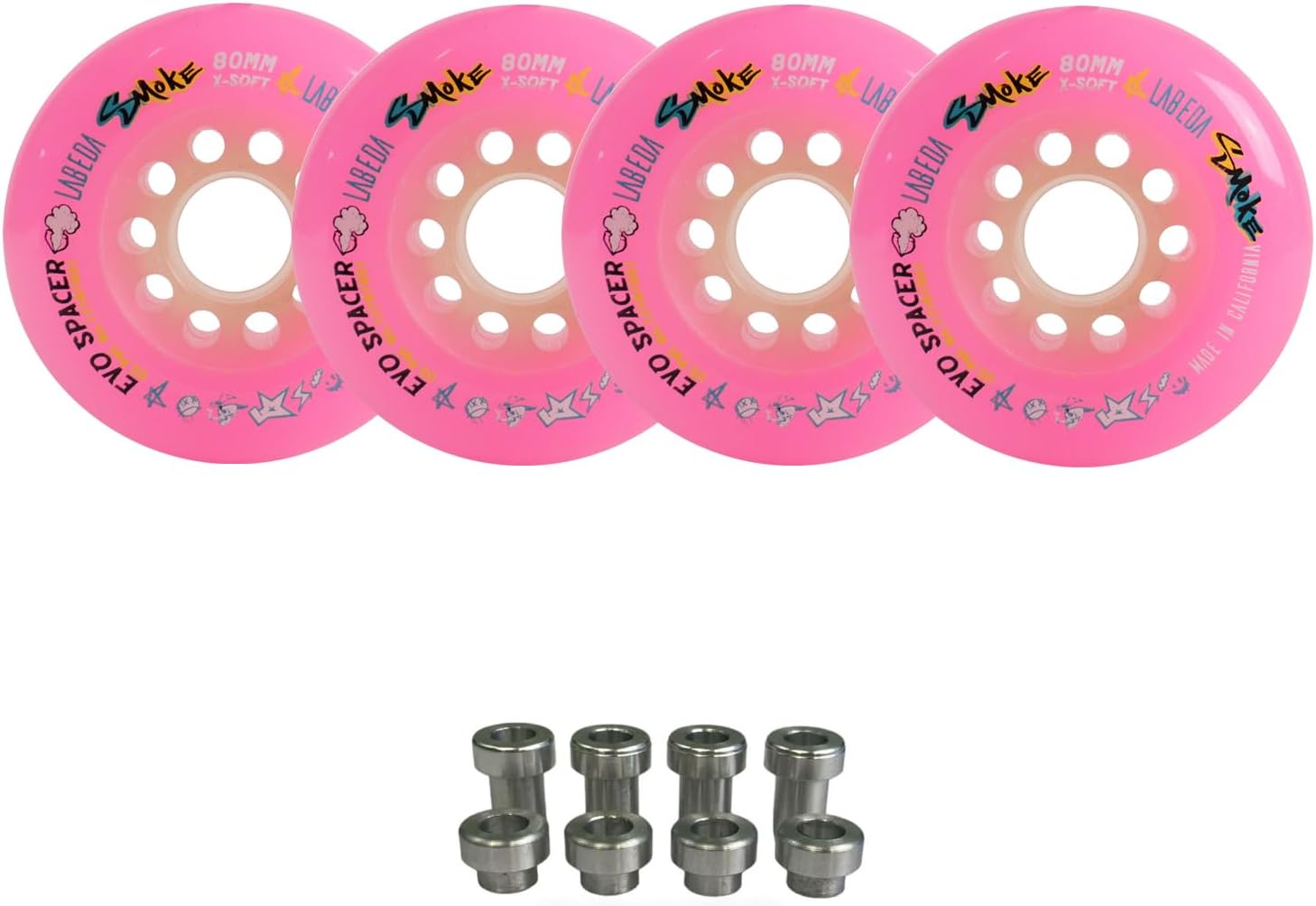 Labeda Smoke Wheels require a specific spacer – if you do not have the spacers, the wheels will not work. Not to worry, this listing includes enough EVO spacers to get you rolling. The EVO spacers only work with standard 6mm axles.The Smoke hasn’t cleared; it’s arrived! The Smoke is the newest addition to the Labeda family of EVO cored wheels. This patented system is trickling down to a streamlined version of the Whip wheel. Our patented free-spin spacer system, with the snap back EVO core, is ready to react to your every move. When games are decided on split second opportunities, don’t settle on performance, you want this Smoke!IDEAL PLAYING SURFACE: StilMat, Sport Court, Plastic Tile. WEIGHT GUIDELINES: Recommended for all players. Do not use on abrasive surfaces like concrete.Hardness is a general guideline to direct a player to a wheel based on the player’s weight and skating ability level. A player may choose a wheel designed for a heavier, or a lighter weight skater. This will allow the player to boost and maximize their grip and/or rolling skate speed. If they have advanced skating skills to compress the wheel enough to grip, or are looking for softer wheels to maximize grip on skating surfaces. Choosing to do either, may cause extended or premature wear.Includes 4 Smoke Evo Wheels with EVO spacers included. Mix and Match to make a full set.