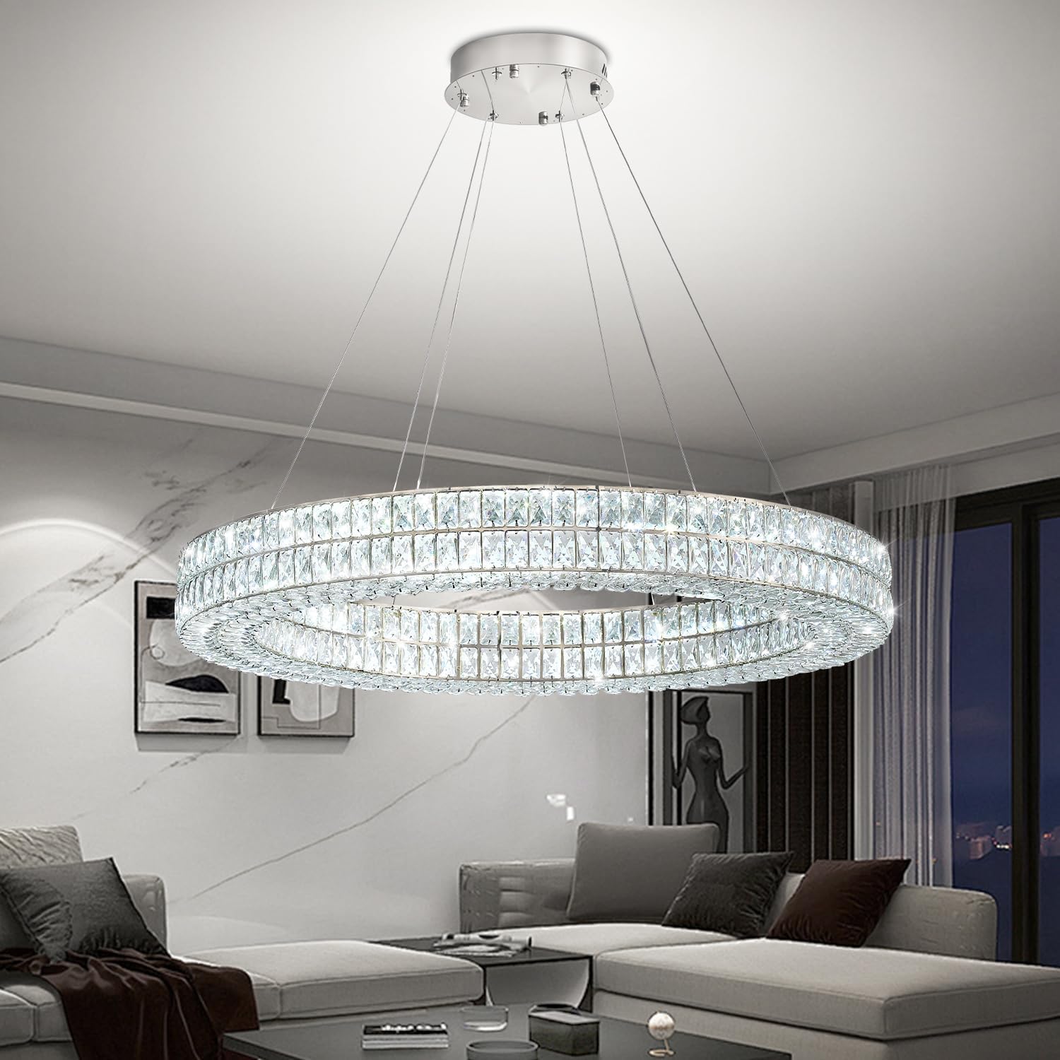• ✨【Modern led crystal chandelier size】 L27.5'' X W27.5'' X H135''. Pendant cord is adjustable. The whole lamp is 135''(11.3feet )tallest. The shortest height is 30. wide and the voltage can be anywhere AC85-256V.