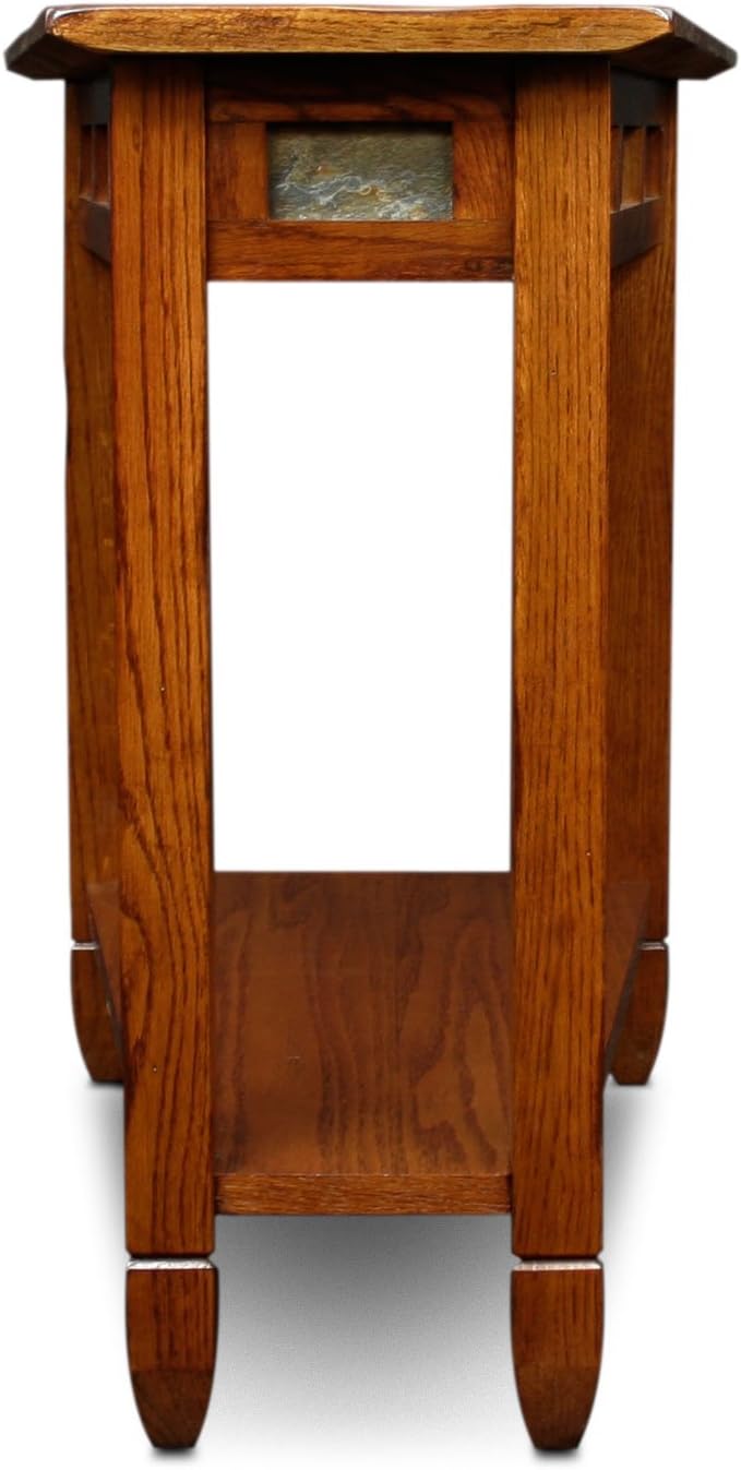 The Leick Rustic Slate Recliner Wedge End Table with natural stone details and a comfortable worn finish that gives this gem an immediate familiar feel. It is scaled to fit where space is at a premium and designed to make the most of it. A perfect choice next to your recliner to set your favorite beverages or a small lamp while displaying a favorite decor item on the lower shelf. Solid wood construction and hand applied multi step Rustic Oak finish will ensure many years of enjoyment. Simple, knock-down assembly ensures that setting up is a snap. Simply attach the legs and you're done! The table takes up a small space with its 10" to 17" W x 24" D x 24" H footprint.