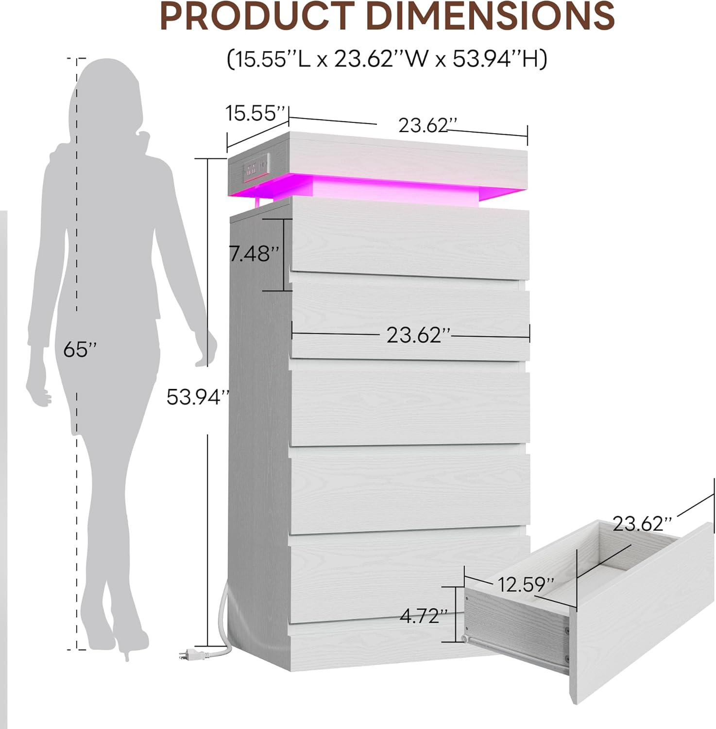 | Included Components | 5 drawer dresser, LED light, power outlet |