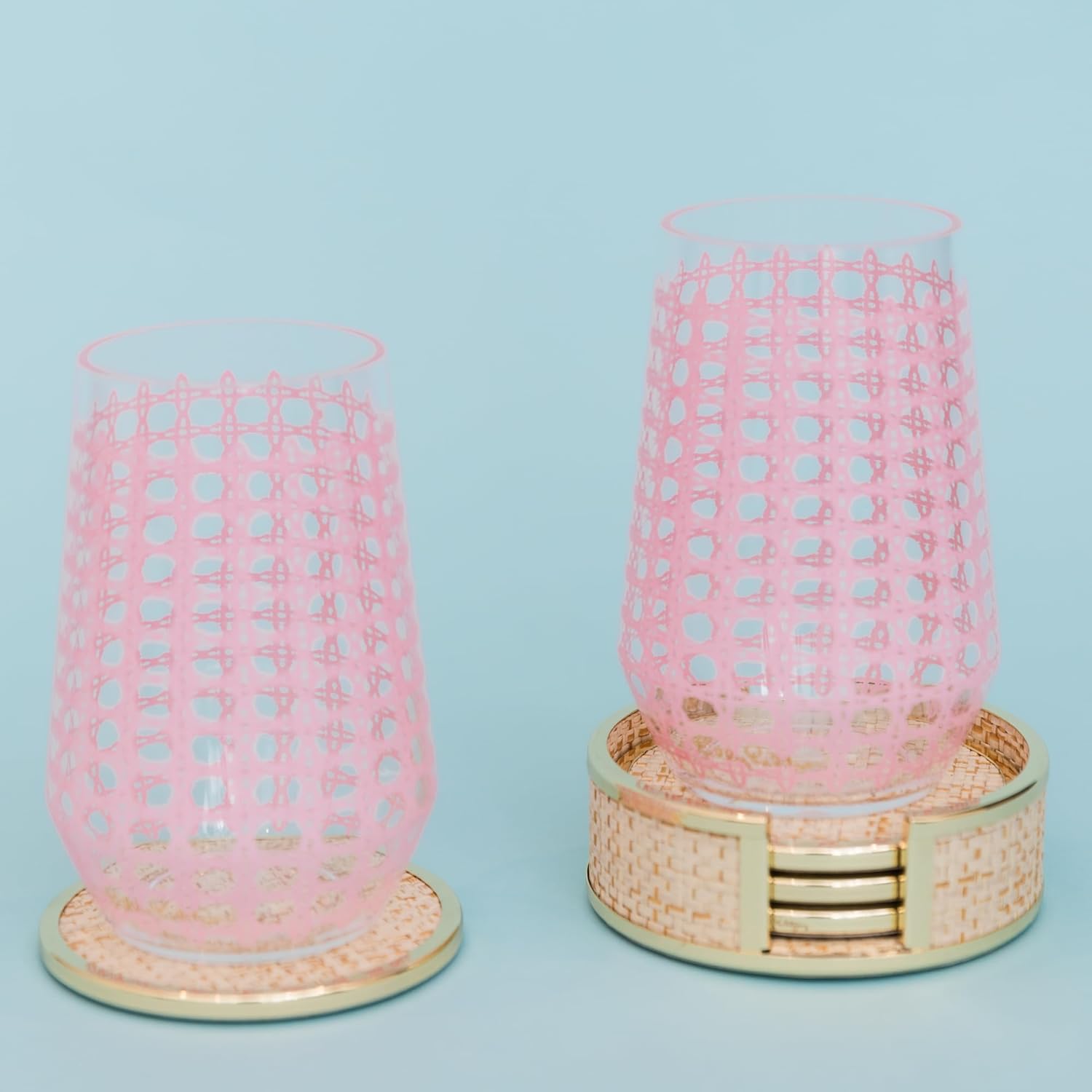 Protect your furniture from all your refreshing beverages with this coaster set! There are 4 coasters included that feature a gold-edge with natural raffia to add a hint of island glam to your home. Each desk coaster measures 4.5 inches (11.4 cm) wide to easily accommodate coffee mugs, water tumblers, wine glasses, and more. Natural coasters have a raffia top surface that is absorbant and finished with a gold logo rim for extra flair. Store them stylishly in the included round coaster holder. Whether used as a decorative accent or a chic kitchen accessory, this decorative coaster set is ready to brighten your home.