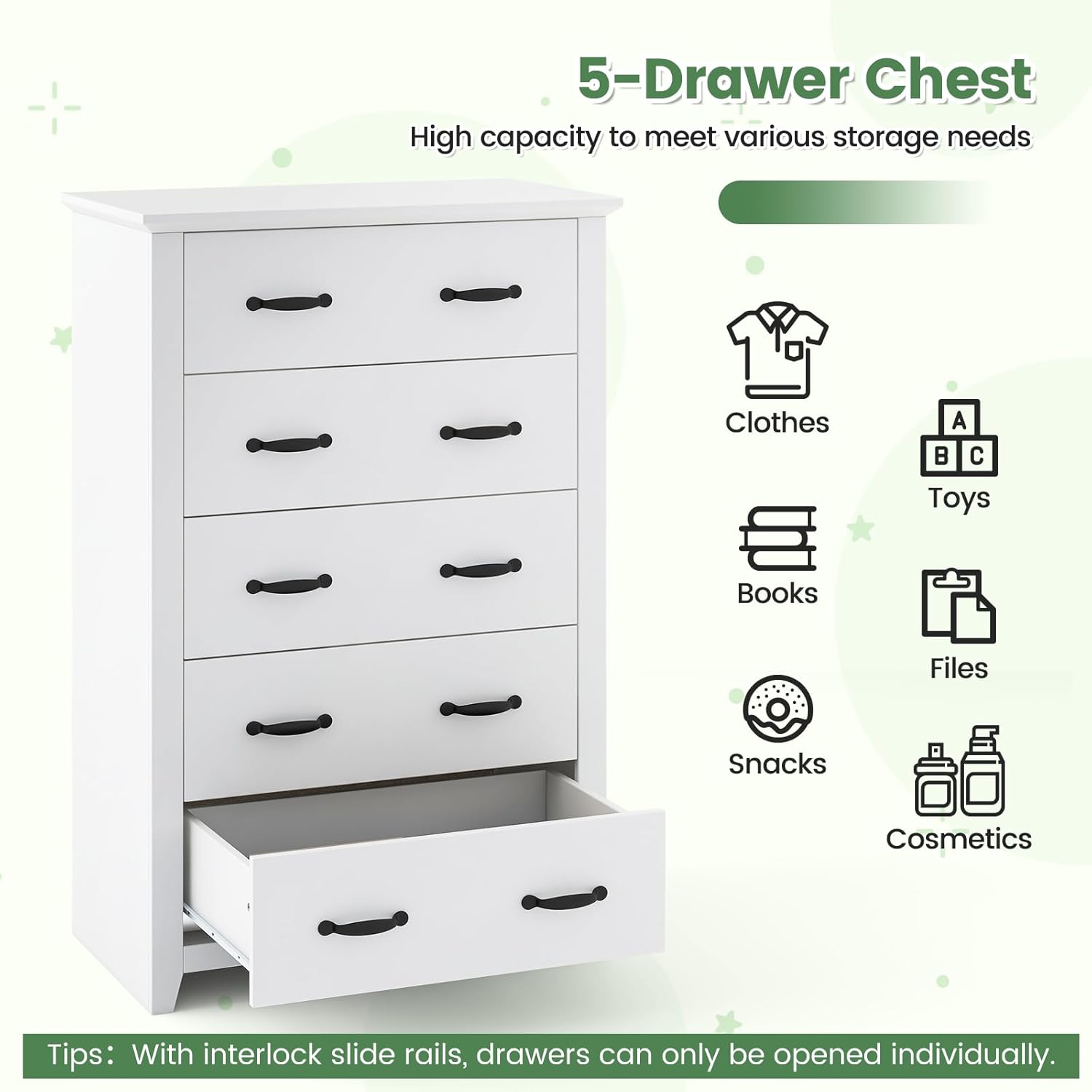 Description: Maximize the Storage Capability with the 5-Drawer Chest! The 5 spacious drawers add incredible storage space to store your clothes, books etc. With double handles and smooth sliding rails, the drawers are easy to open and close. Carefully crafted from durable MDF, the chest of drawers is sturdy and strong enough to bear lots of weight. What's more, the anti-tipping device is included to securely fix the dresser to the wall, reducing the risk of tip-overs. Completed with white finish, the modern dresser cabinet matches well in bedroom, living room, office, hallway, and so on.Features: 5-drawer chest for organizing clothes, books etc.Drawers with double handles are easy to pull out/inAnti-tipping device is fitted to avoid tip-over accidentsAnti-slip foot pads protect floor from being scratchedThickened and durable MDF material is built to lastMatches well with living room, bedroom, entrywayEasy to assemble with easy-to-follow instructionsSpecifications: Color: WhiteMaterial: MDFOverall Dimension: 31" x 17" x 47" (L x W x H)Drawer Size: 23.5" x 13.5" x 5.5" (L x W x H)Net Weight: 113 lbsWeight Capacity of Cabinet Top: 66 lbsWeight Capacity of Each Drawer: 66 lbsPackage Includes:1 x 5-drawer Chest1 x User Guide