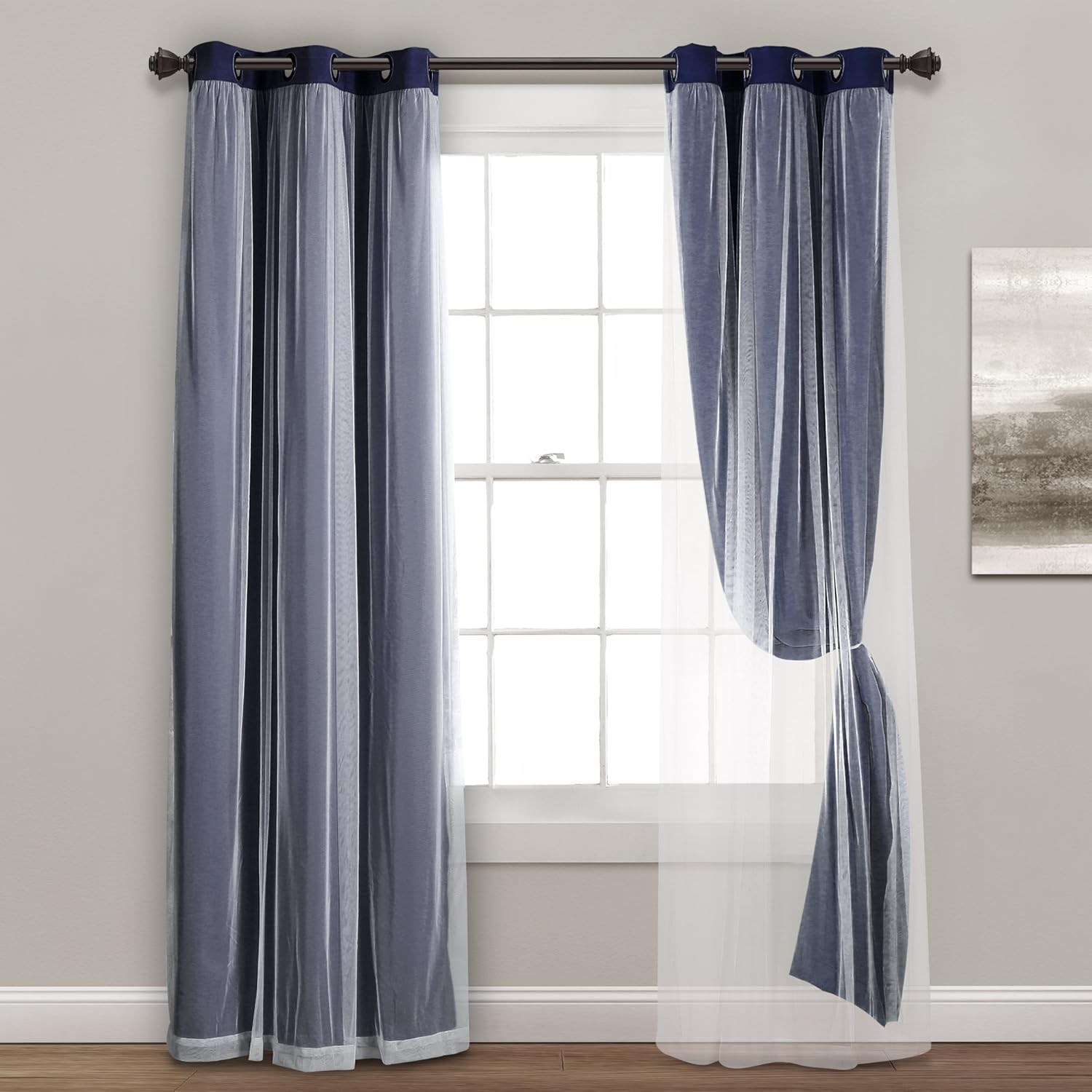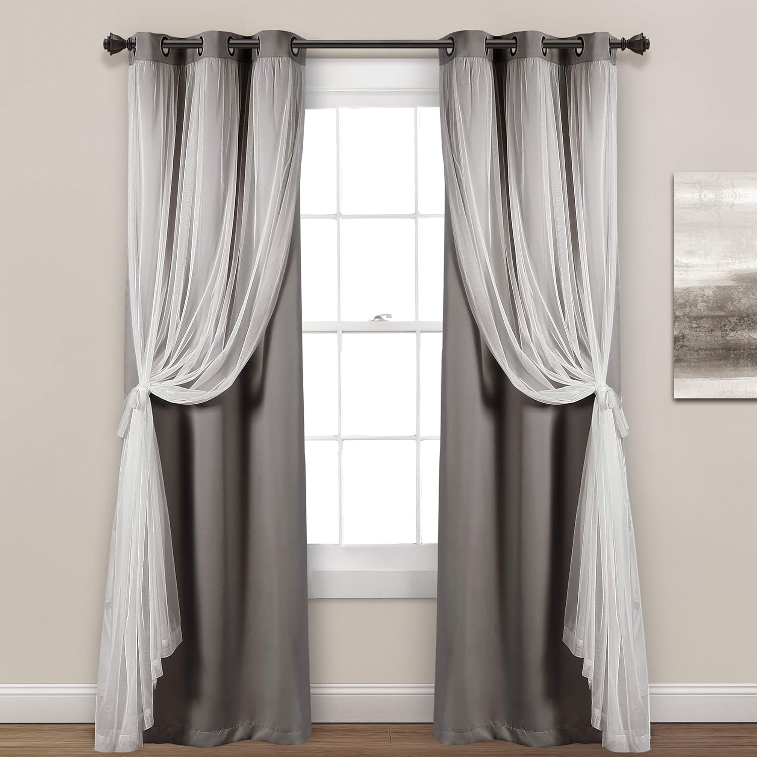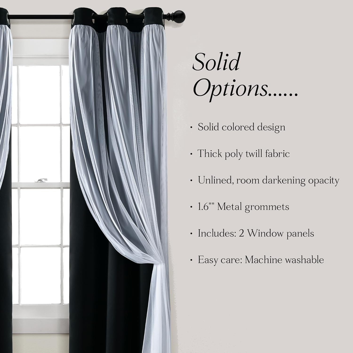 The Lush Decor Sheer Grommet Curtains With Insulated Blackout Lining Window Curtain Panel Set gives you multiple looks in one set, while adding luxury to your bedroom, living room, or dining room decor. These curtains offer you the best of both worlds because you have the option of nearly complete blackout or sheer together in one affordable curtain panel set. The classic solid-color design of the blackout lining panel fits in nearly any home decor style. The white sheer overlay panel allows lots of natural light to enter your space while still providing some privacy from onlookers. The blackout panels are energy efficient and help you enjoy your privacy with additional benefit of reducing outside noise. Ideal for those in need of daytime rest, whether you work the night shift or have a little one who requires daytime naps, these blackout curtains create the perfect environment for uninterrupted sleep. Not to mention, the blackout lining will help keep your home cool in the summer and warm in the winter by blocking the sunlight and keeping temperatures stable. With 2 layers, the styling options are endless with these functional window panels, letting you customize your look using tie backs (not included). They can easily be used in farmhouse, modern, traditional and many other design themes. Each set includes two panels, each measuring 38 inches in width, and is available in multiple length options. Easily install these curtains with the metal grommets by sliding each panel onto your curtain rod. To care for these curtains simply machine wash and hang to dry. Please refer to label for full care instructions. Please note: the tiebacks shown in some photos are not included with the Sheer Grommet With Insulated Blackout Lining Curtain Panel Set and will have to be purchased separately.