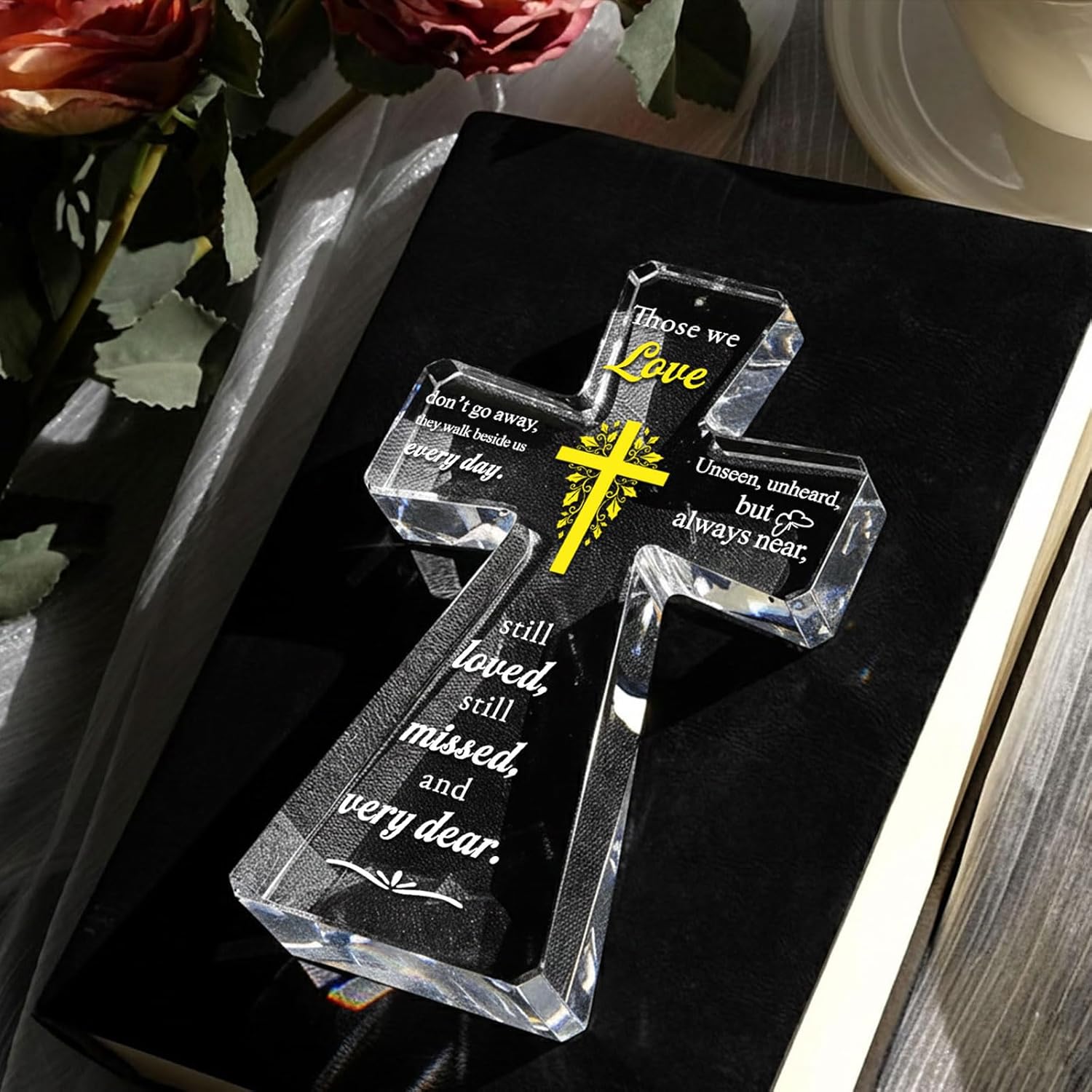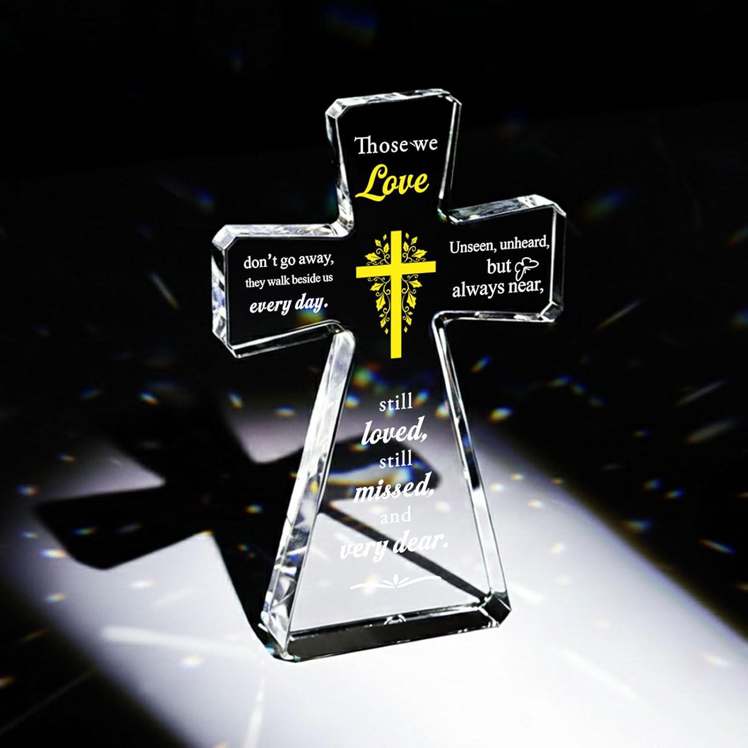 Some people never truly leave us. They live on in our memories, our hearts, and the quiet moments of everyday life. This Christian Memorial Crystal Cross is designed to honor that eternal connection. With its touching words of remembrance and radiant crystal craftsmanship, it serves as a symbol of enduring love, faith, and comfort during times of loss. Whether given as a sympathy gift or kept as a personal keepsake, this cross offers peace, hope, and a gentle reminder: those we love are always near.