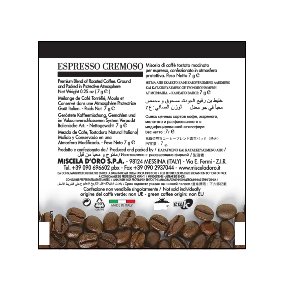 The Urbano family business began operating in 1946 in the town center, where the company's founder, aided by his wife, began roasting small amounts of coffee beans at an artisan level. The fundamental rule was the meticulous selection of the very best green coffee. The founder's technical knowledge and his sensitivity towards customer requirements, joined by research and experimentation with top quality blends, transformed the artisan workshop into a small family business in the middle of the 1950's, operating with the latest equipment and deeply rooted in the provincial territory. The unwavering faith of its customers, the guarantee of coffee with constant quality and the tireless search for new formulas to satisfy the demands of an evolving society enabled the company to increase the sales volume. Miscela d'Oro Cremoso espresso pods produce rich authentic Italian espresso with a thick crema. These E.S.E. style espresso pods feature delicious Italian espresso coffee that has been perfectly pre-ground, pre-tamped then pressed between two pieces of special filter paper and ready for brewing. Each espresso pod is individually wrapped for freshness. Compatible with all espresso machines designed to accept ESE coffee pods (45 mm, 7 g).