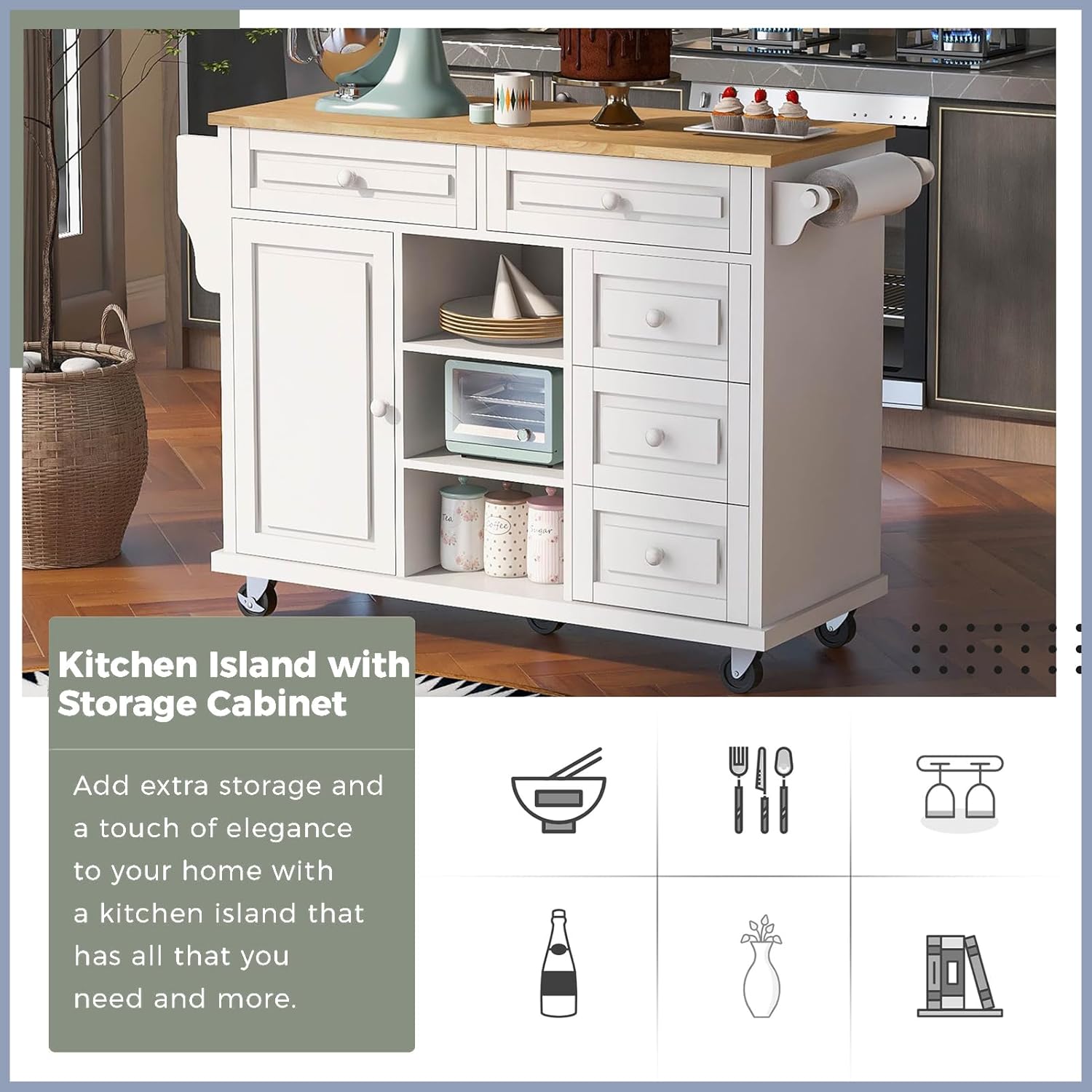 Mobile Kitchen Island Cart with Rubber Wood Desktop, Rolling Coffee Cart Microwave Stand with Storage Cabinet & 5 Drawers & Spice Rack & Towel Rack for Home Specifications: Tabletop Weight Capacity: 220LBS Shelf Weight Capacity: 50LBS Suggested Number of People: 2 Estimated Time to Assemble: 60-90 minutes Material: MDF and Rubber Wood Notice -Manual measurement has been used -Items may slightly differ from photo in terms of color due to the lighting or your monitors display.