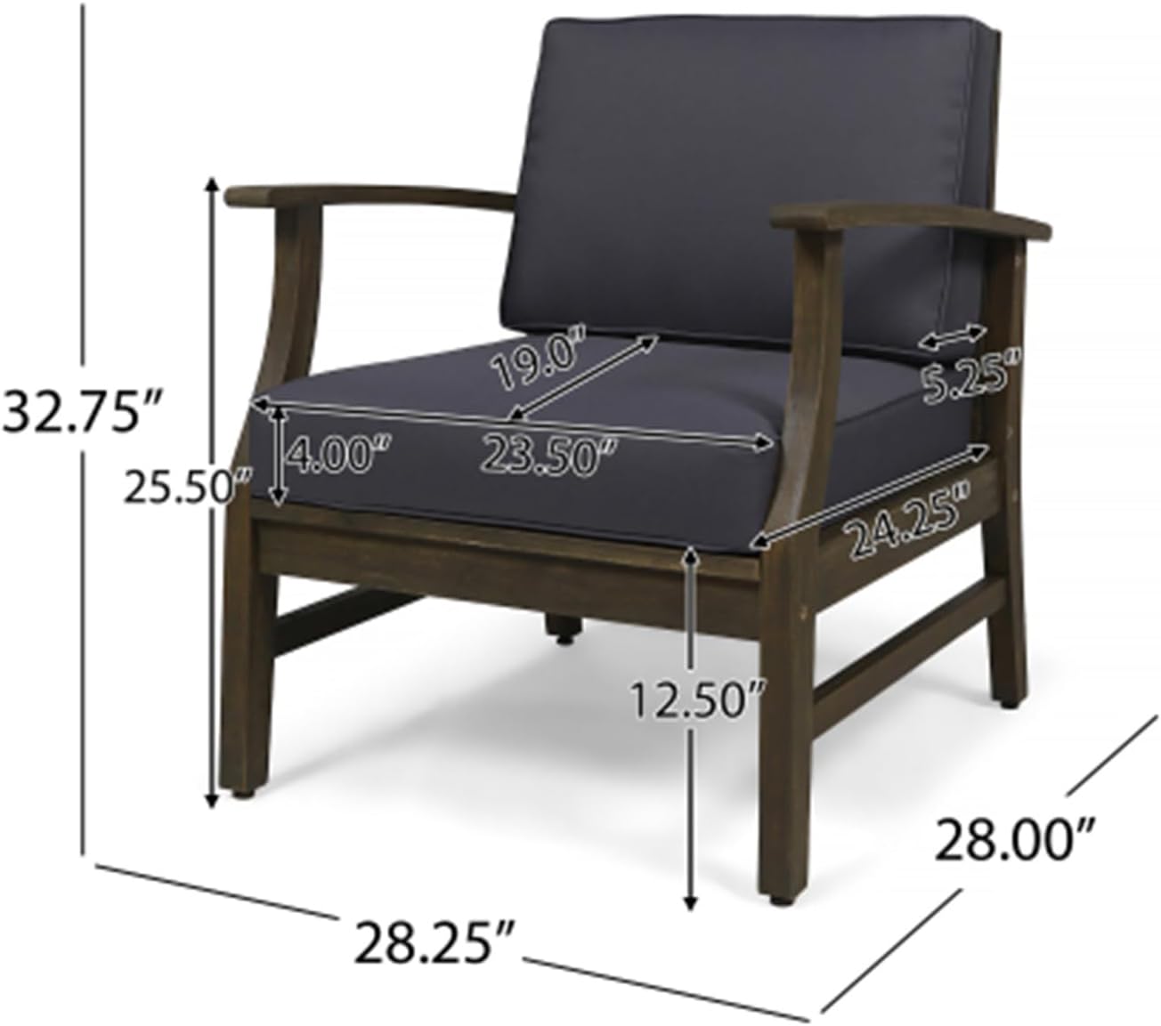 Product Information Product Type: General Merchandise Product Name: Club Chair, Dark Gray Main Color: Dark Gray Main Material: Acacia Product Dimensions Assembled Length (inches): 28.25 Assembled Width (inches): 28.00 Assembled Height (inches): 32.75 Weight (pounds): 27.56