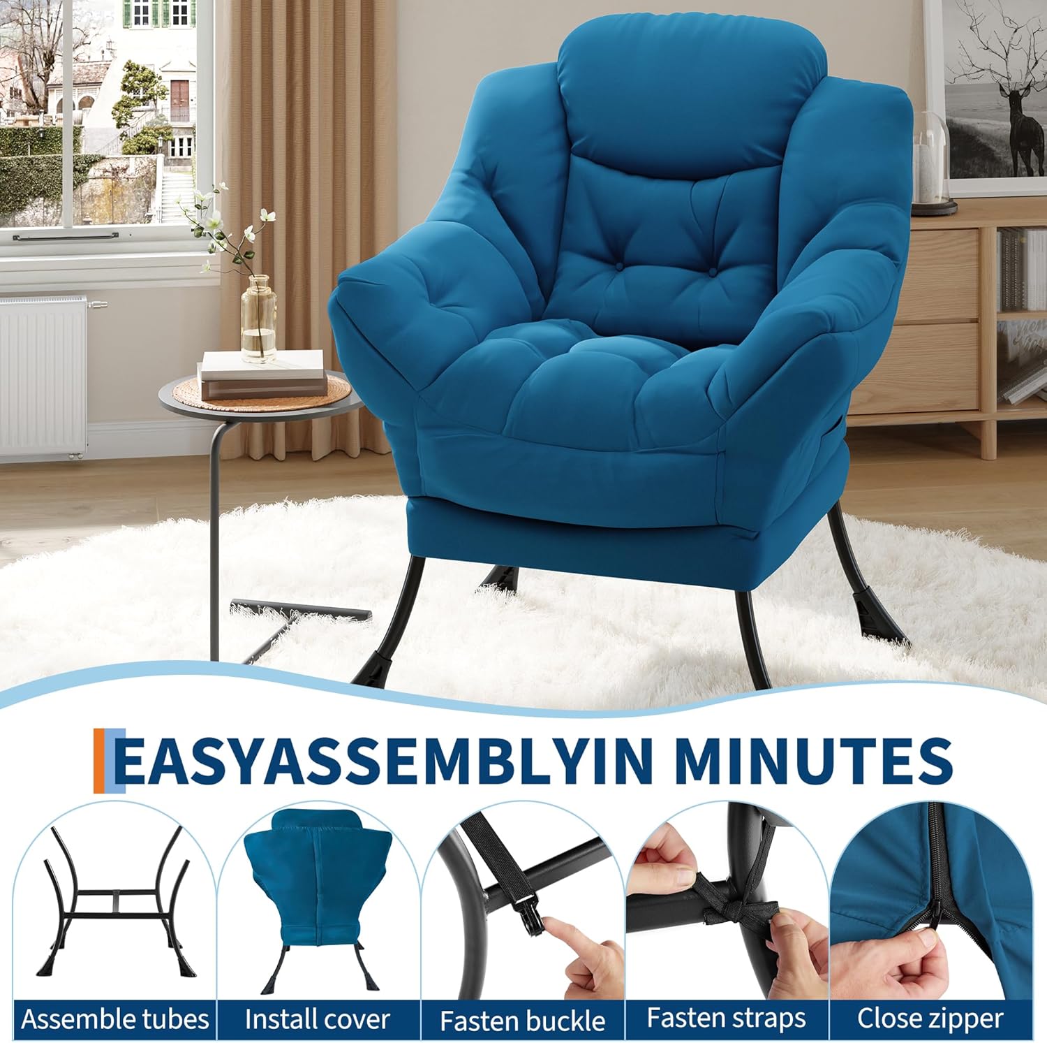 enhance Your Living Space with best Comfort & Modern StyleIntroduce a new level of relaxation to your home with our luxurious lounge chair, thoughtfully designed to blend ergonomic comfort and sleek, contemporary aesthetics. With its soft, deep seat and supportive head pillow, this accent chair is perfect for lounging, reading, or simply unwinding after a long day. Whether placed in your living room, bedroom, dorm, or office, its versatile style complements any decor.standard Comfort: Upholstered in soft, breathable fabric and filled with high-density foam or cotton for lasting coziness and support.Deep Seating & Ergonomics: Features a generously sized deep seat, ergonomic armrests, and a soft head pillow to promote full-body relaxation.Sturdy & Safe: Built with a durable metal frame and non-slip feet, ensuring stability and safety on any surface.Convenient Storage: Includes a handy side pocket for easy access to books, remotes, or magazines, keeping basic within reach.Collapsible Ottoman (on select models): Choose versions with a collapsible footrest/ottoman for the best lounging experience—use it as a footstool, extra seat, or even in your hallway.Effortless Assembly: Simple structure with clearly labeled parts and step-by-step instructions allow for quick and easy setup in minutes.Versatile Placement: Perfect as a cozy reading chair, bedroom chair, or stylish accent in compact spaces, apartments, and dorms.Specifications:Chair Size: 33.4 x 29.5 x 39.4 inchesOptional Ottoman Size: 16.5 x 14.5 x 14 inchesColor Options: Grey, Deep Grey, BlueMaterial: Metal Frame + High-Density Foam or CottonCare advice:Avoid sharp objects to protect the soft fabric.Use the side pocket for small items to keep your space organized.Fluff cushions regularly to maintain their shape and comfort.Packing List:Lounge Chair x1Hardware Bag x1Assembly Guide x1Ottoman x1 (if included)Transform any room into a cozy retreat with this modern accent chair—where comfort meets style.