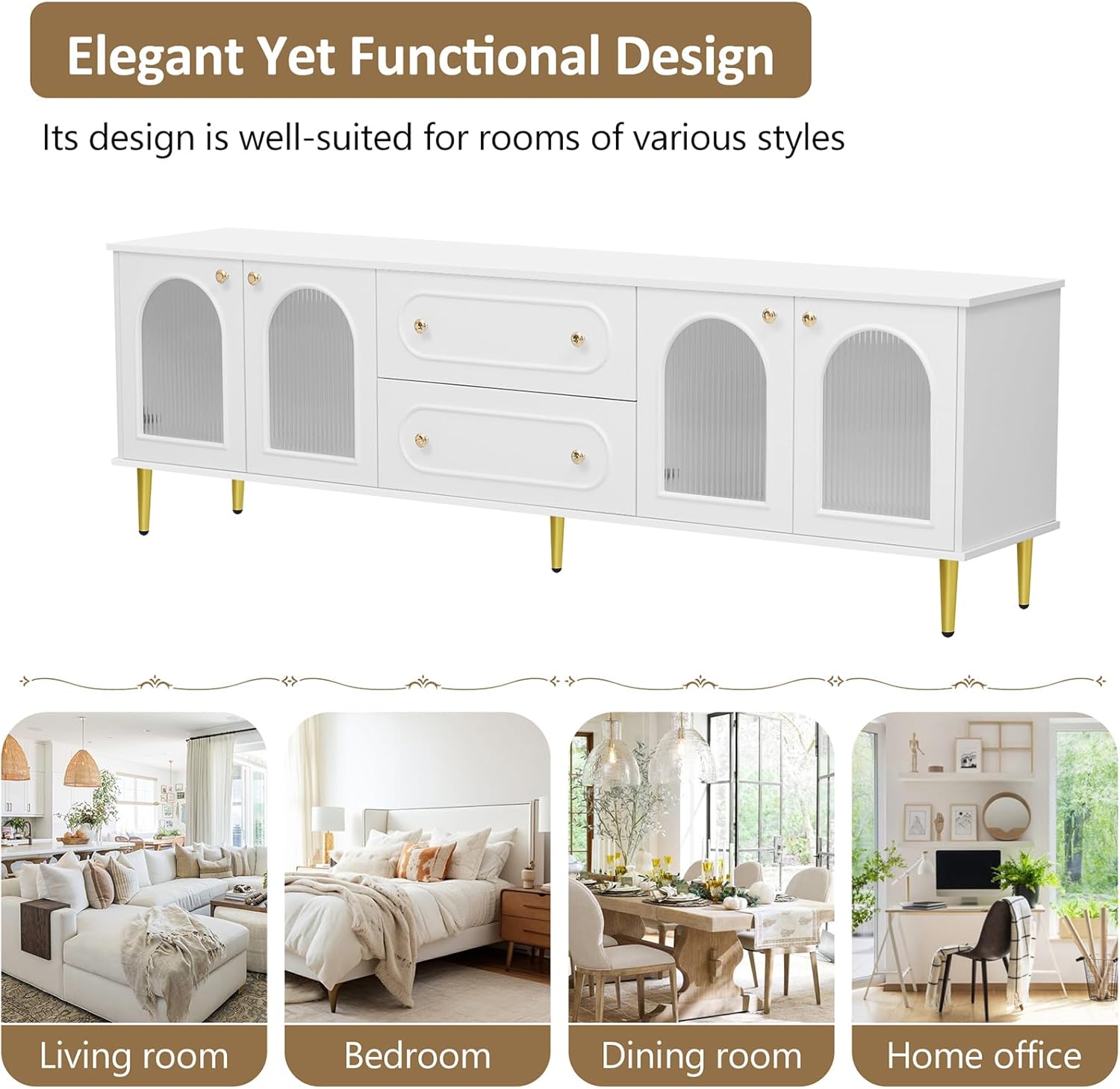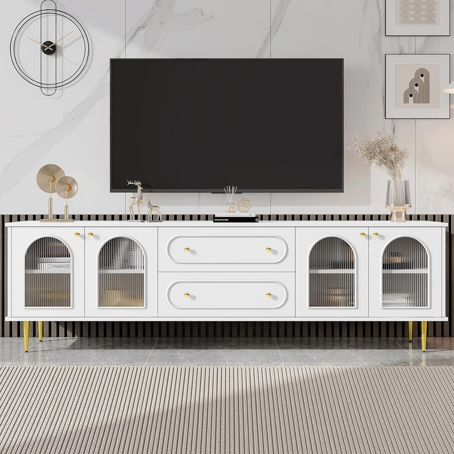 Modern TV Stand for 55 60 65 75 85inch TV, Mid Century Modern TV Cabinet, Entertainment Center Media Console with 2 Drawers and 2 Cabinets for Living Room Detailed Measurement Overall: 78.7'' W x 15.7'' D x 24.4'' H, 88.66lbs Tabletop Thickness: 0.6 inch Clearance - Floor to Bottom: 5.9 inch Max TV Screen Size: 85 inches Table Top Weight Capacity: 110 LBS Product details Product Type: TV Stand Main Material: MDF Door Material: MDF + Glass Leg&Handle Material: Metal Is the leg adjustable?: Yes, Adjustable by 0.4inch Cable Management: Yes Level of Assembly: Full Assembly Needed Suggested Number of People for Assembly/Install: 2 Estimated Time to Set Up: 2 h Adult Assembly Required: Yes Additional Tools Required (Not Included): Power Drill Recommended Country of Origin: China